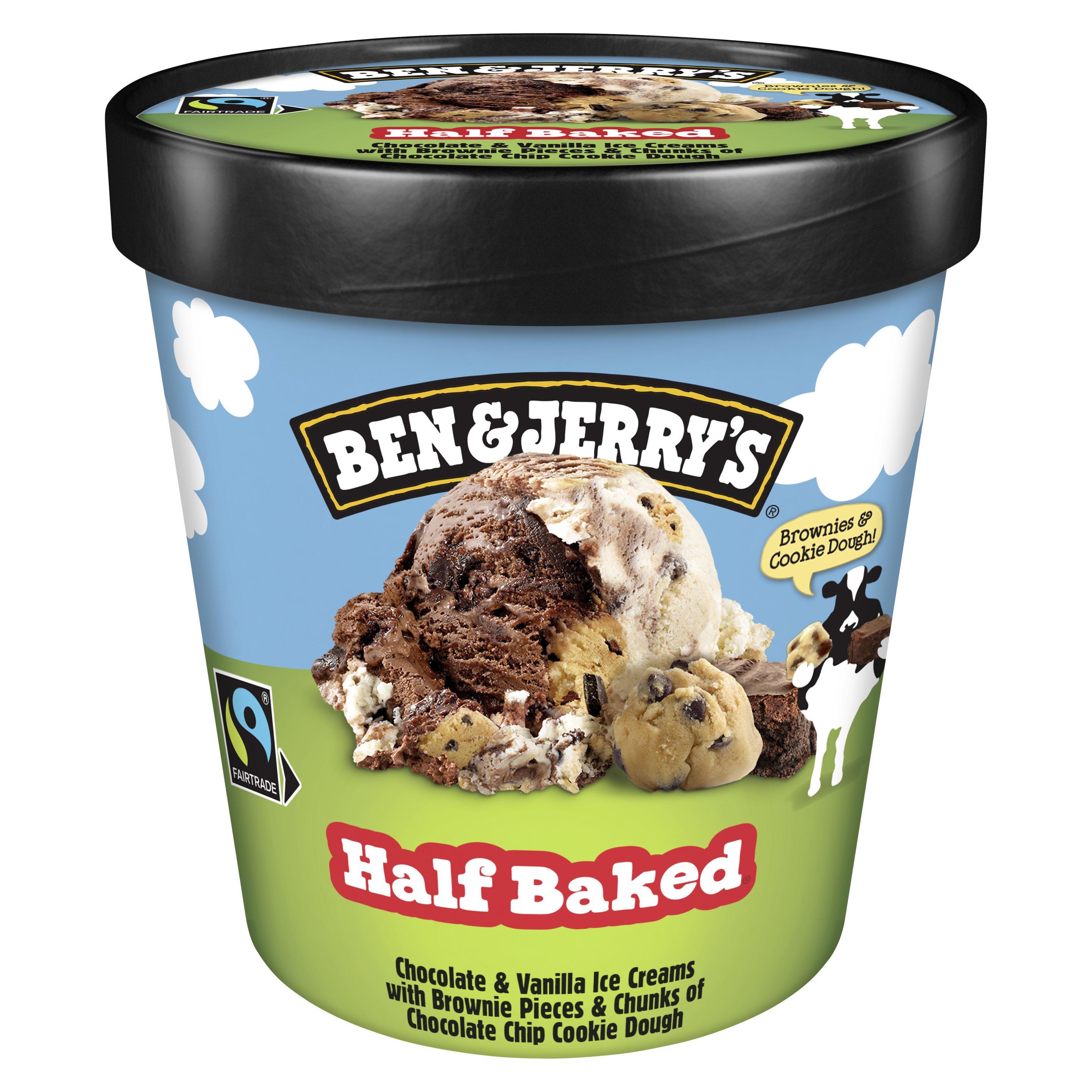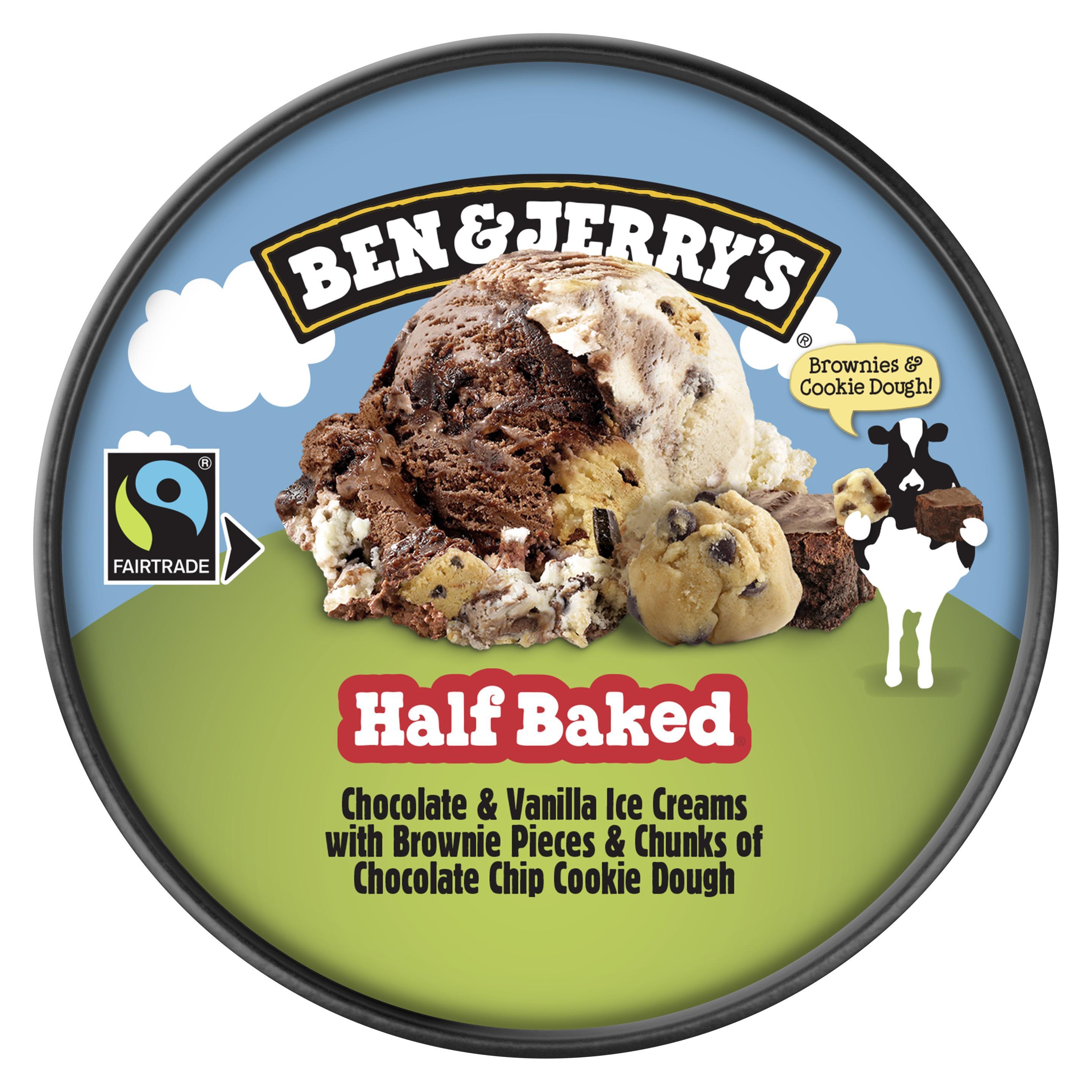 Ben & Jerry’s Half Baked ist Schokoladen- und Vanilleeiscreme mit Schokogebäckstücken, kakaohaltigen Bits und Cookieteig-Stücken.