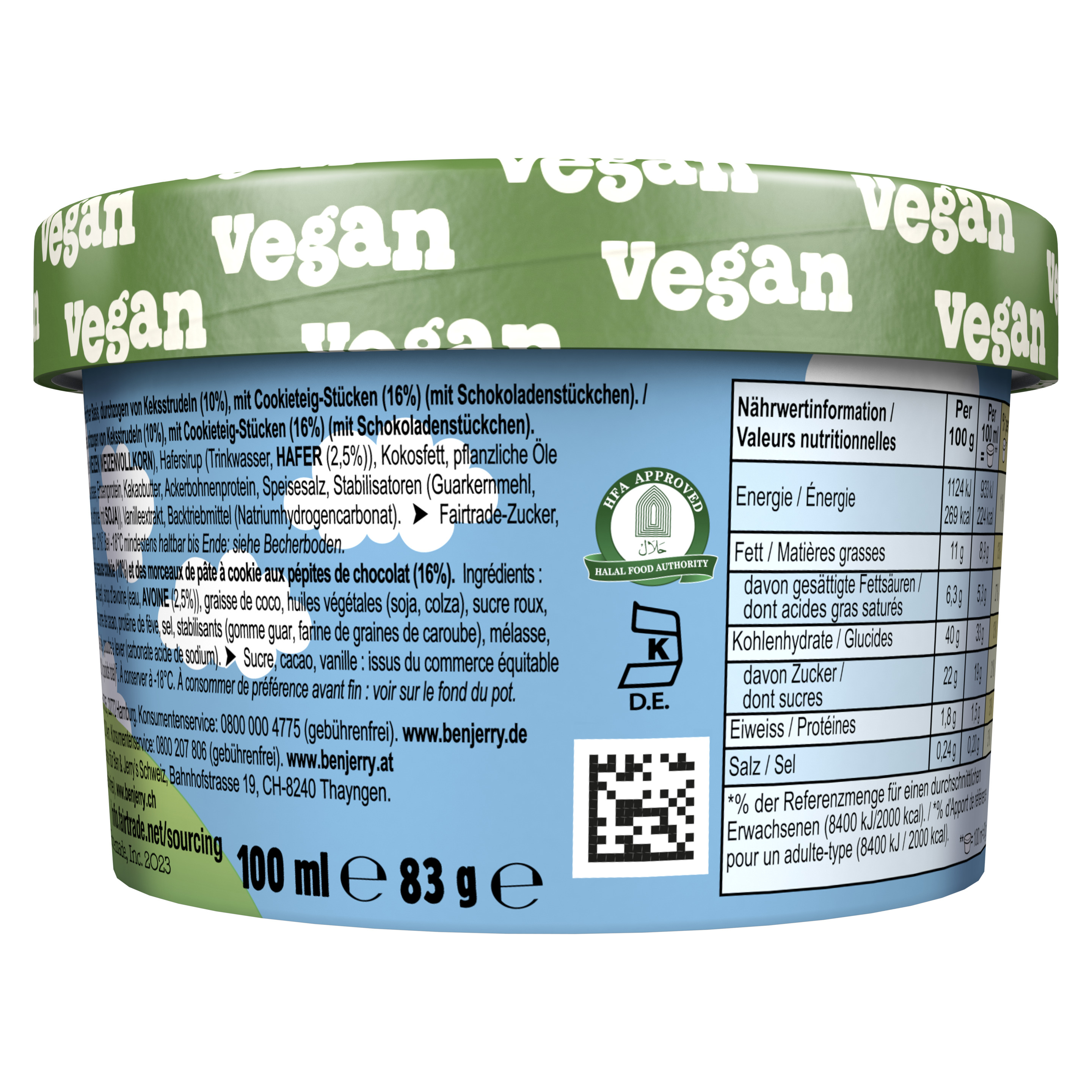 Karamelleis auf pflanzlicher Basis, durchzogen von Keksstrudeln (10%), mit Cookieteig-Stücken (16%) (mit Schokoladenstückchen).