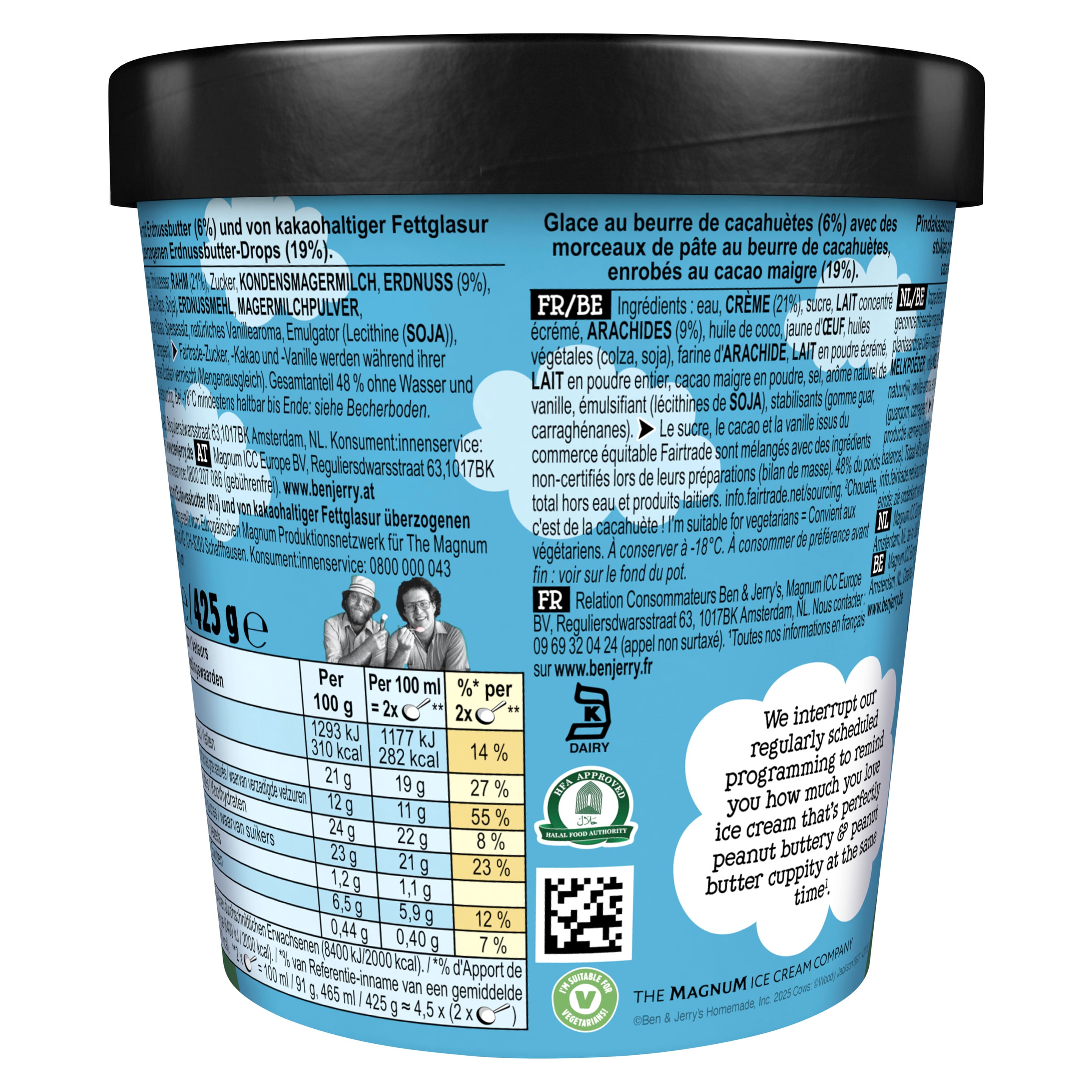 Zutaten: Trinkwasser, RAHM (21%), Zucker, KONDENSMAGERMILCH, ERDNUSS (9%), Kokosfett, EIGELB, pflanzliche Öle (Raps, Soja), ERDNUSSMEHL, MAGERMILCHPULVER, VOLLMILCHPULVER, fettarmer Kakao, Speisesalz, natürliches Vanillearoma, Emulgator (Lecithine (SOJA)), Stabilisatoren (Guarkernmehl, Carrageen).Fairtrade-Zucker, -Kakao, -Vanille mit Mengenausgleich. Gesamtanteil: 48% ohne Wasser und Molkereiprodukte(F).