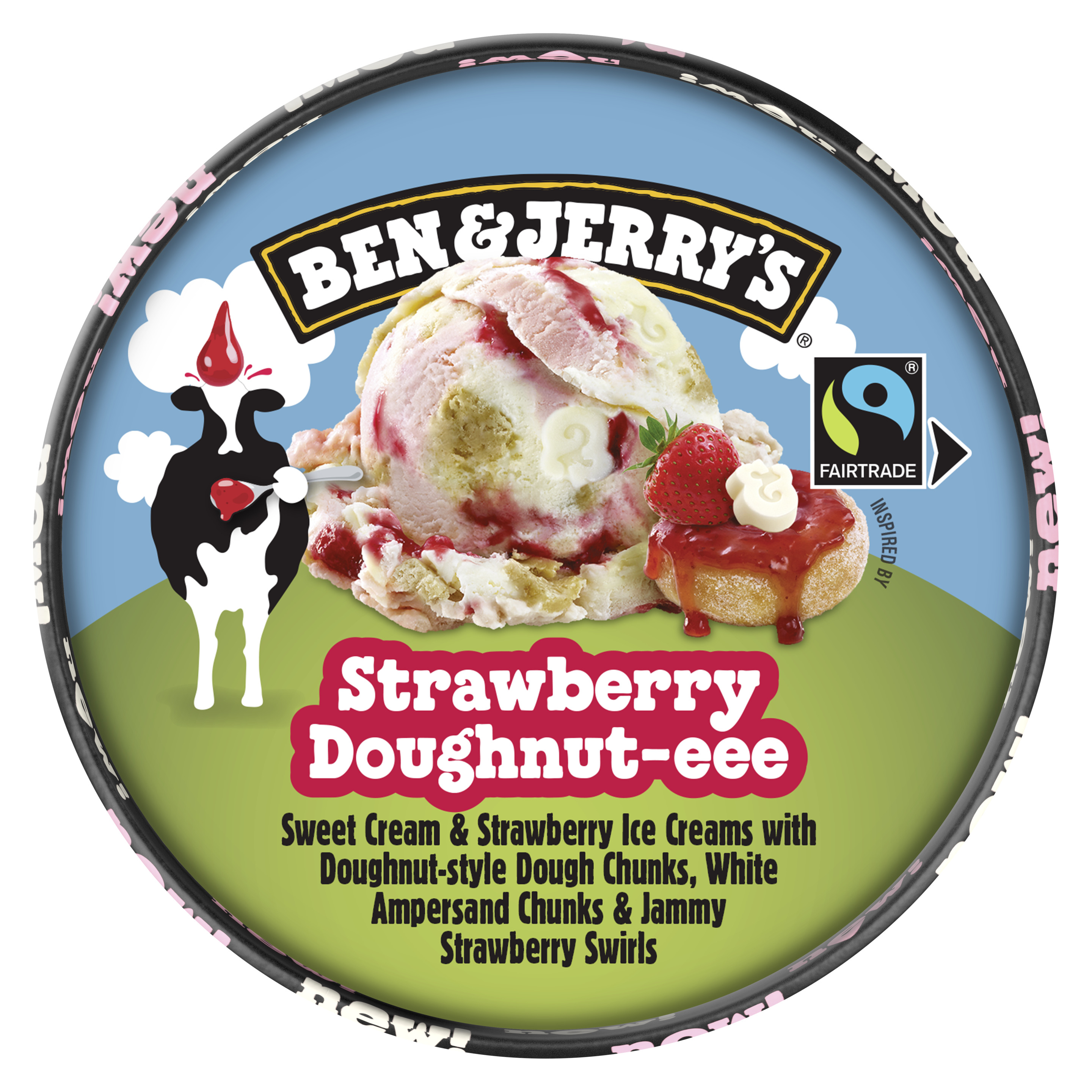 Eiscreme und Erdbeerfruchteiscreme mit Teig-Stücken mit Doughnut-Geschmack (6%) und weißen Fettglasurstücken (4,5%), durchzogen von Erdbeersauce (10%).