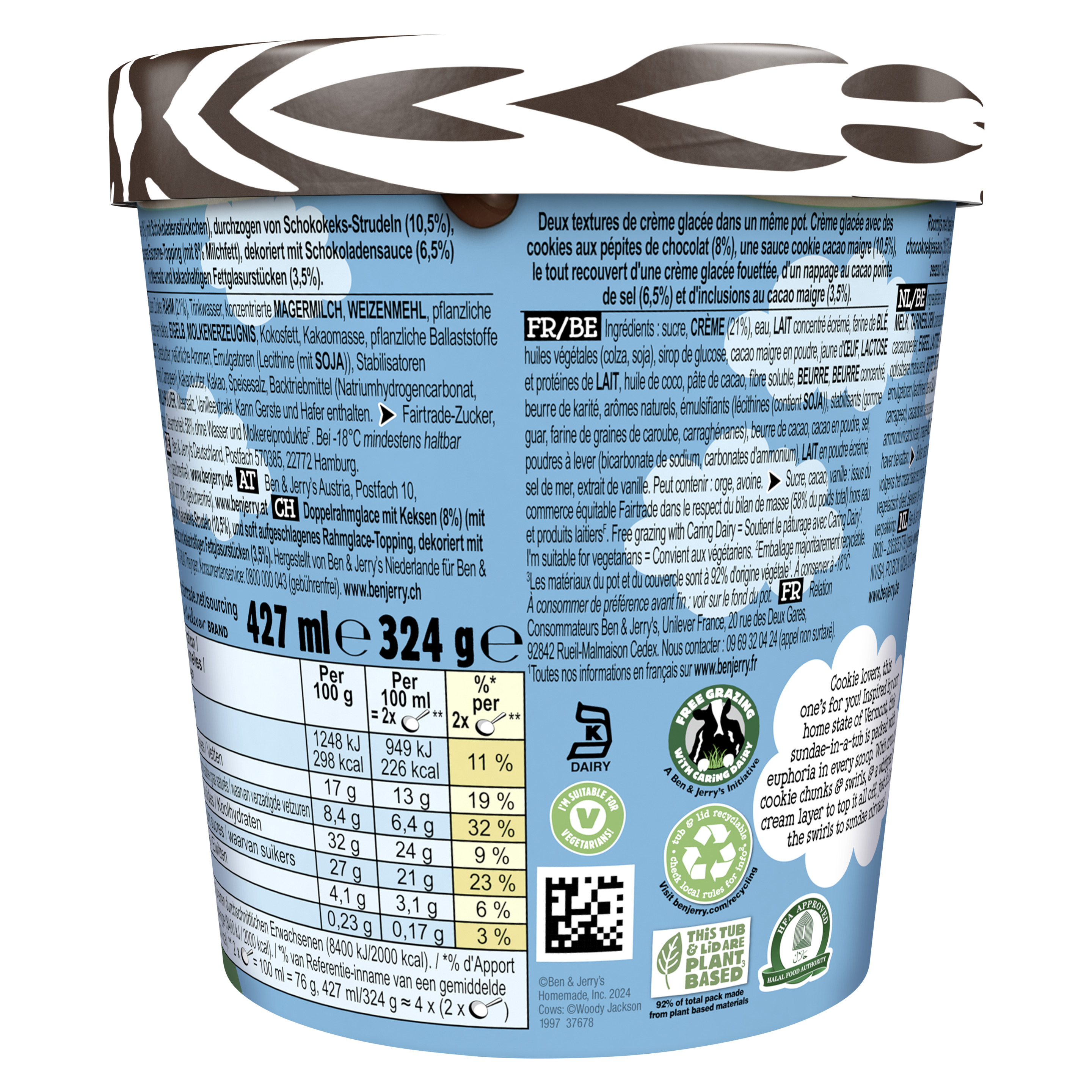 Eiscreme mit Keksen (8%) (mit Schokoladenstückchen), durchzogen von Schokokeks-Strudeln (10,5%), und soft aufgeschlagenes Eiscreme-Topping (mit 8% Milchfett), dekoriert mit Schokoladensauce (6,5%) mit Meersalz und kakaohaltigen Fettglasurstücken (3,5%).