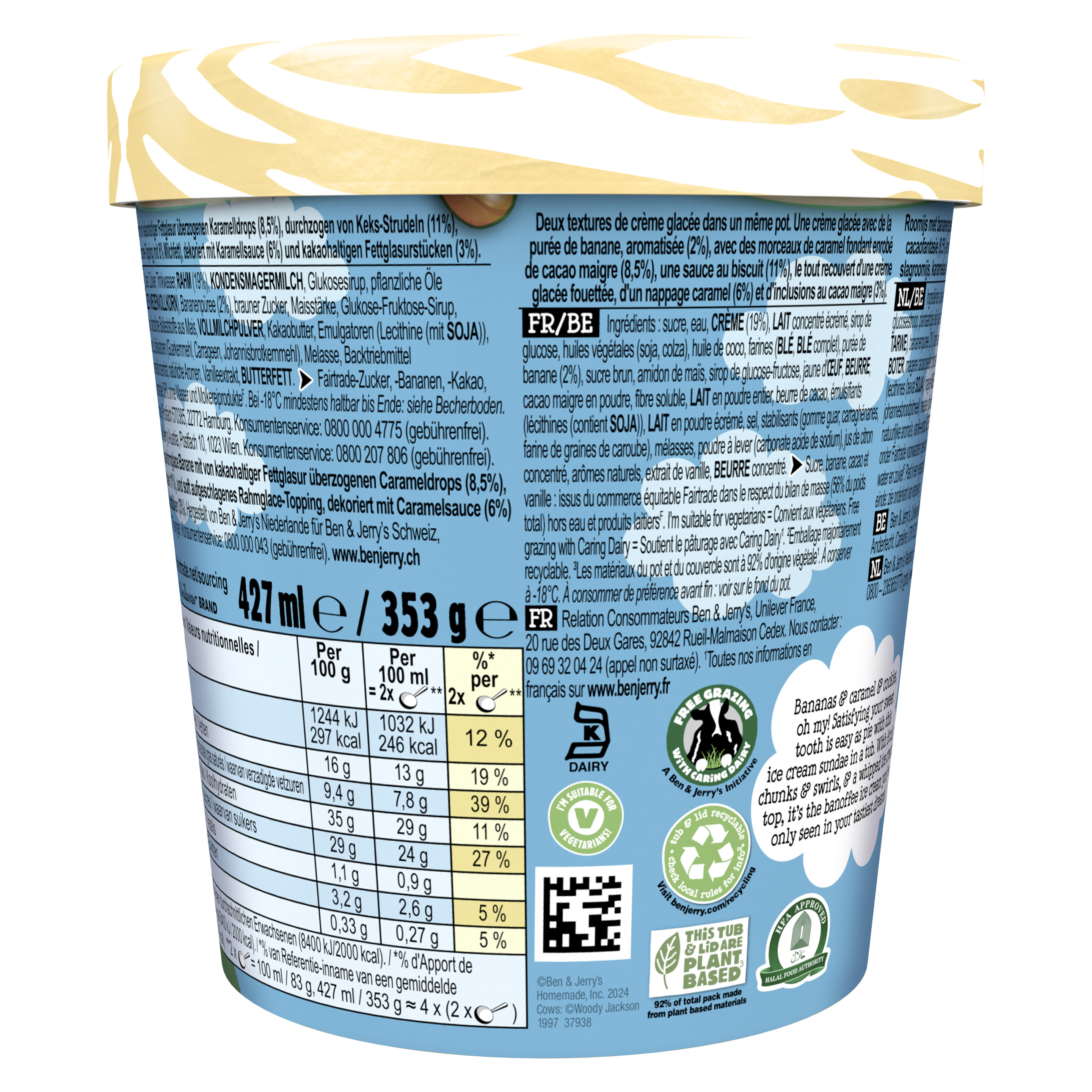 Fruchteiscreme Banane mit von kakaohaltiger Fettglasur überzogenen Karamelldrops (8,5%), durchzogen von Keks-Strudeln (11%), und soft aufgeschlagenes Eiscreme-Topping (mit 8% Milchfett), dekoriert mit Karamellsauce (6%) und kakaohaltigen Fettglasurstücken (3%).