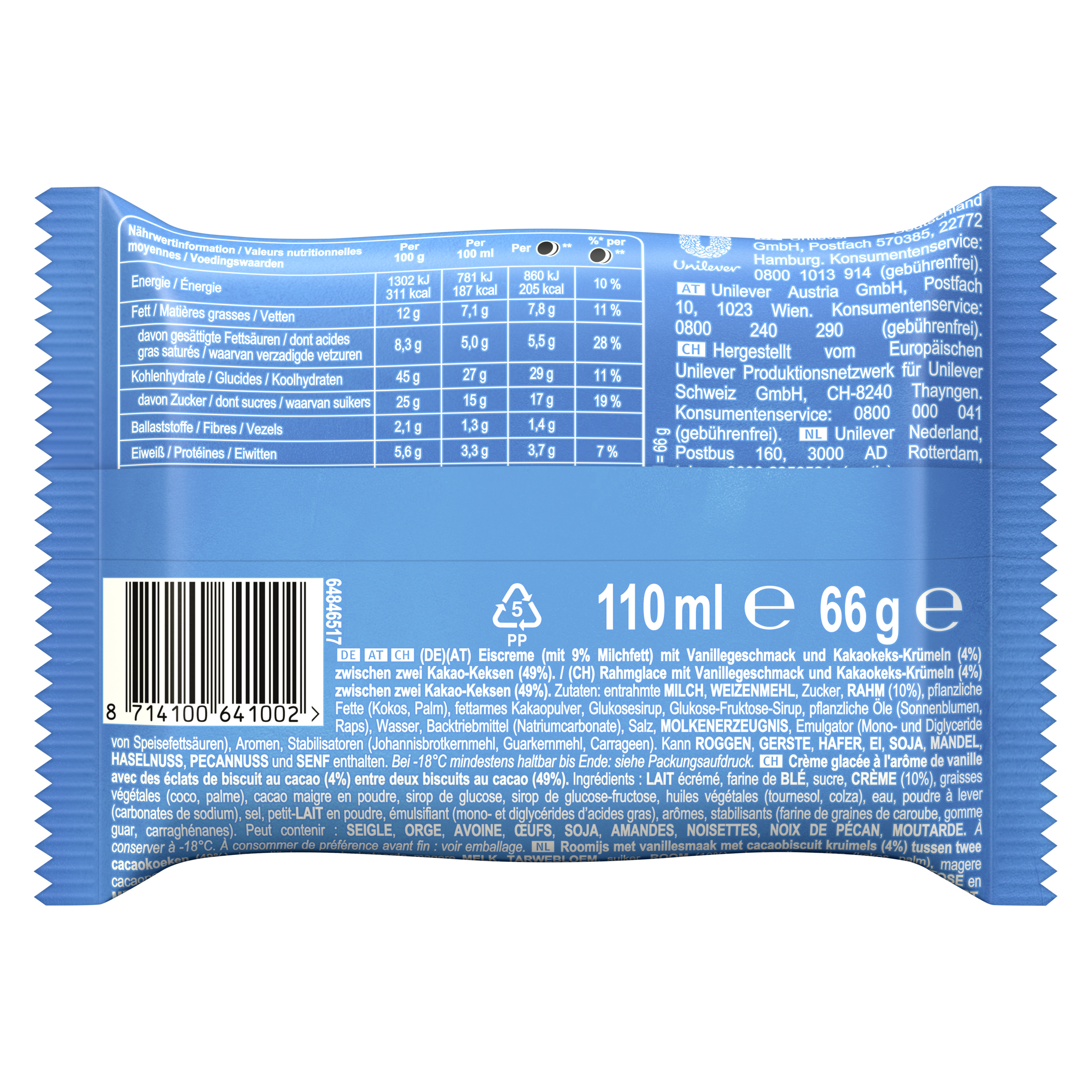 Eiscreme (mit 9% Milchfett) mit Vanillegeschmack und Kakaokeks-Krümeln (4%) zwischen zwei Kakao-Keksen (49%).
