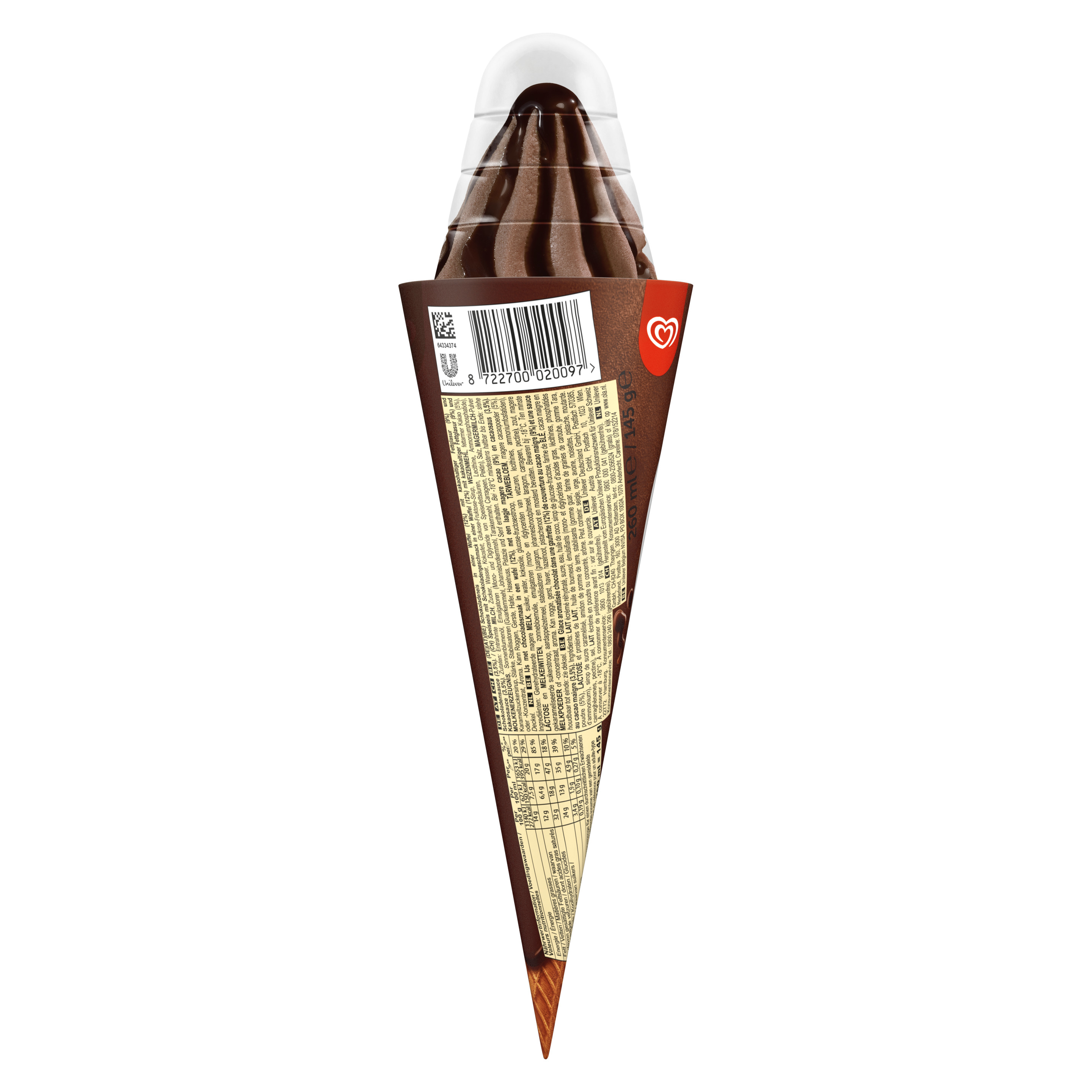 Schokoladeneis in einer Waffel (12%) mit kakaohaltiger Fettglasur (9%) und Schokoladensauce (3,5%).