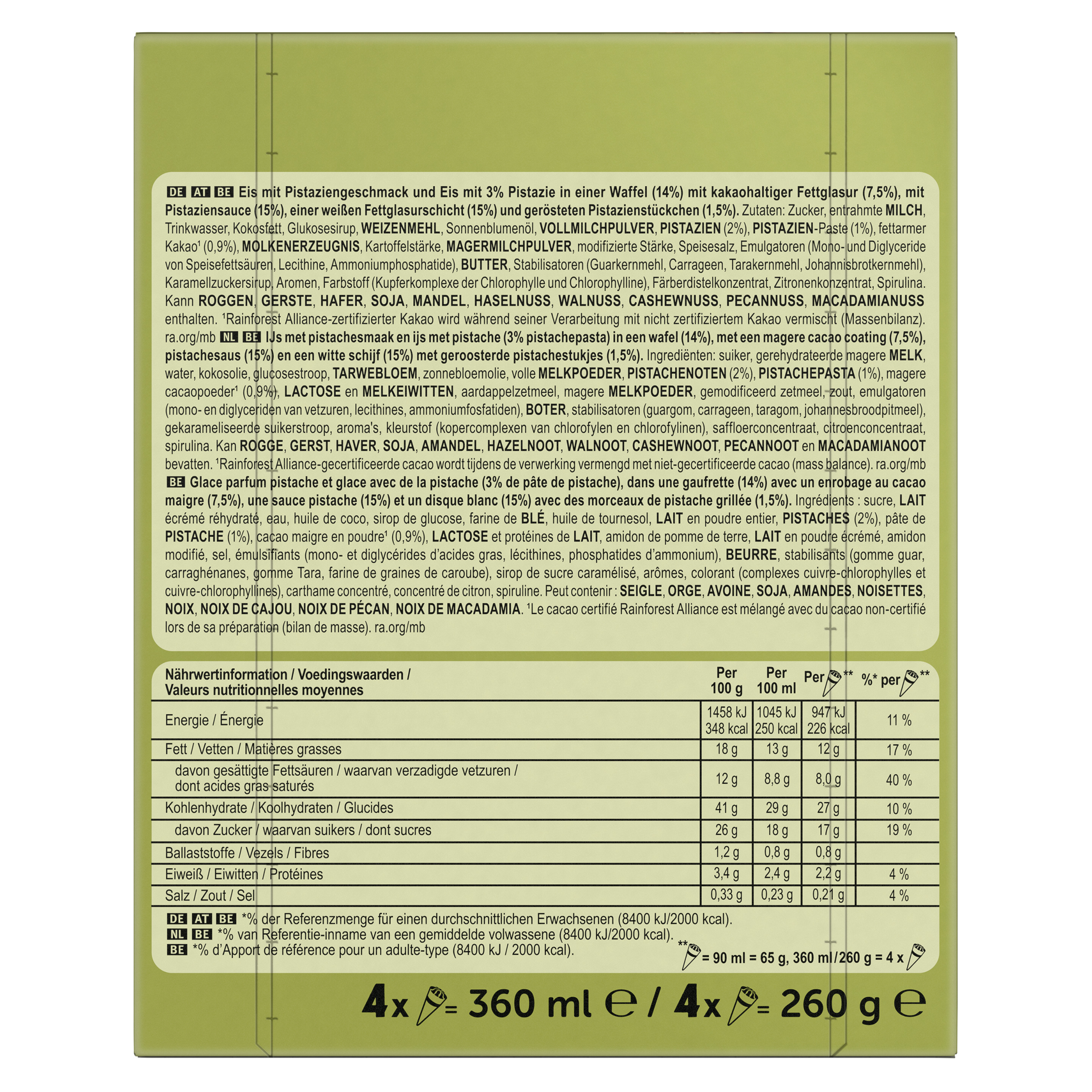Eis mit Pistaziengeschmack und Eis mit 3% Pistazie in einer Waffel (14%) mit kakaohaltiger Fettglasur (7,5%), mit Pistaziensauce (15%), einer weißen Fettglasurschicht (15%) und gerösteten Pistazienstückchen (1,5%).