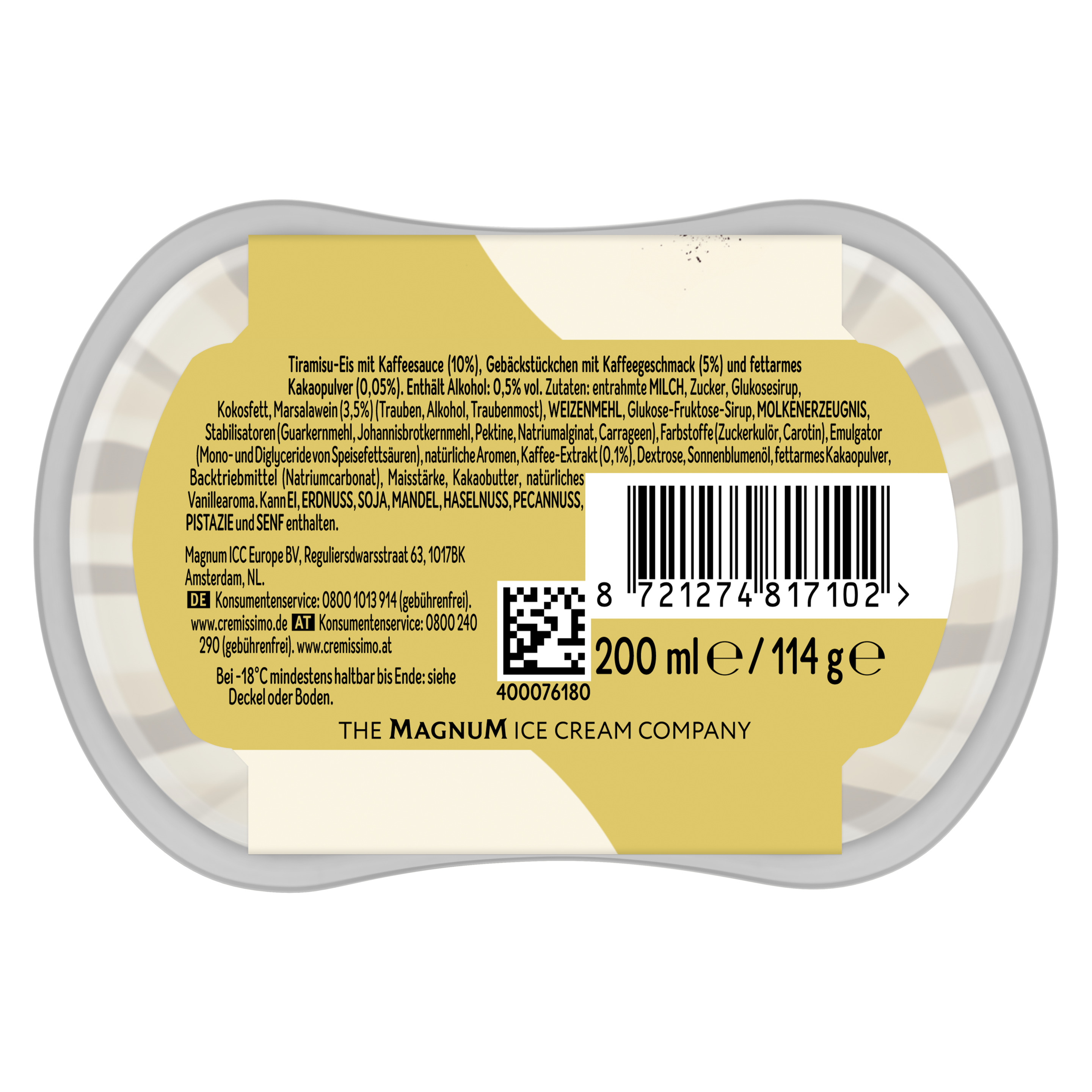 Tiramisu-Eis mit Kaffeesauce (10%), Gebäckstückchen mit Kaffeegeschmack (5%) und fettarmes Kakaopulver (0,05%). Enthält Alkohol: 0,5% vol.