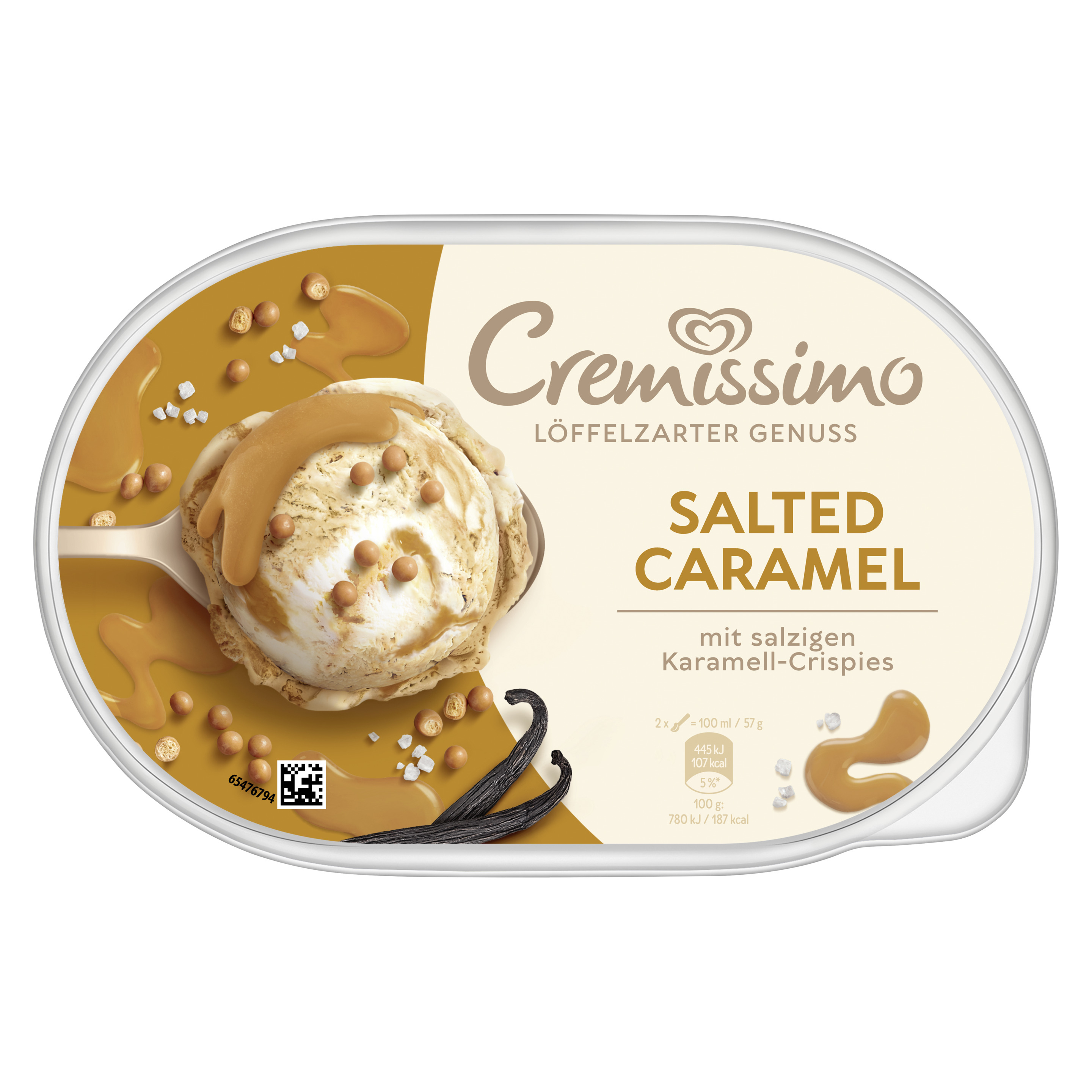 Cremissimo Salted Caramel Eis ist cremiges Karamelleis und Vanilleeis, durchzogen von gesalzener Karamellsauce und verfeinert mit salzigen Karamell-Gebäck-Crispies. Ob pur, zum Kuchen oder in Kombination mit Waffeln und Crêpes – der Eis-Klassiker rundet jedes Dessert perfekt ab und macht es zu einem einmalig raffinierten Eisgenuss.