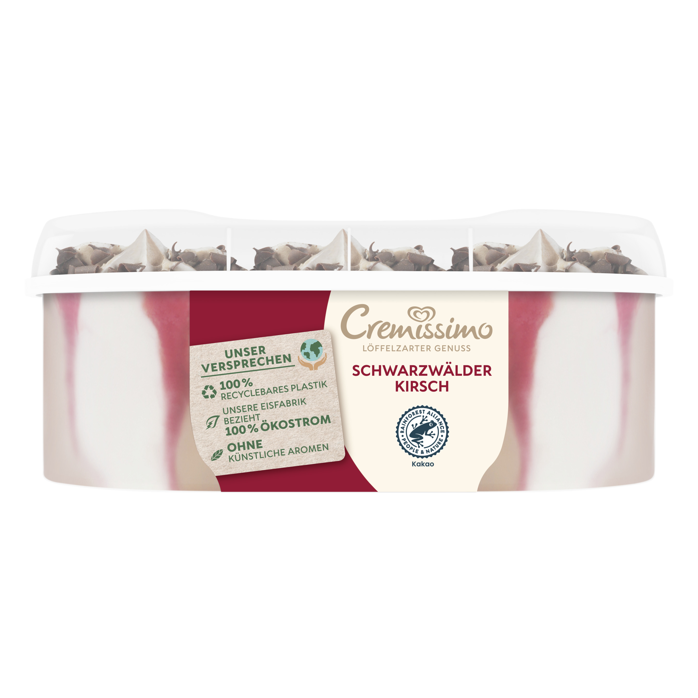 Jetzt die Cremissimo Interpretation von einem der bekanntesten Tortenklassiker probieren. Cremissimo Schwarzwälder Kirsch ist löffelzartes Milchschokoladeneis und Eis mit einem Schuss Schwarzwälder Kirschwasser, durchzogen von einer fruchtigen Sauerkirschsauce und mit knackigen Schokoladenstückchen mit Rainforest Alliance-zertifiziertem Kakao verfeinert. Ob pur, mit frischen Früchten oder in Kombination mit Waffeln und Crêpes – der Eis-Klassiker rundet jedes Dessert perfekt ab und macht es zu einem einmalig raffinierten Genuss.