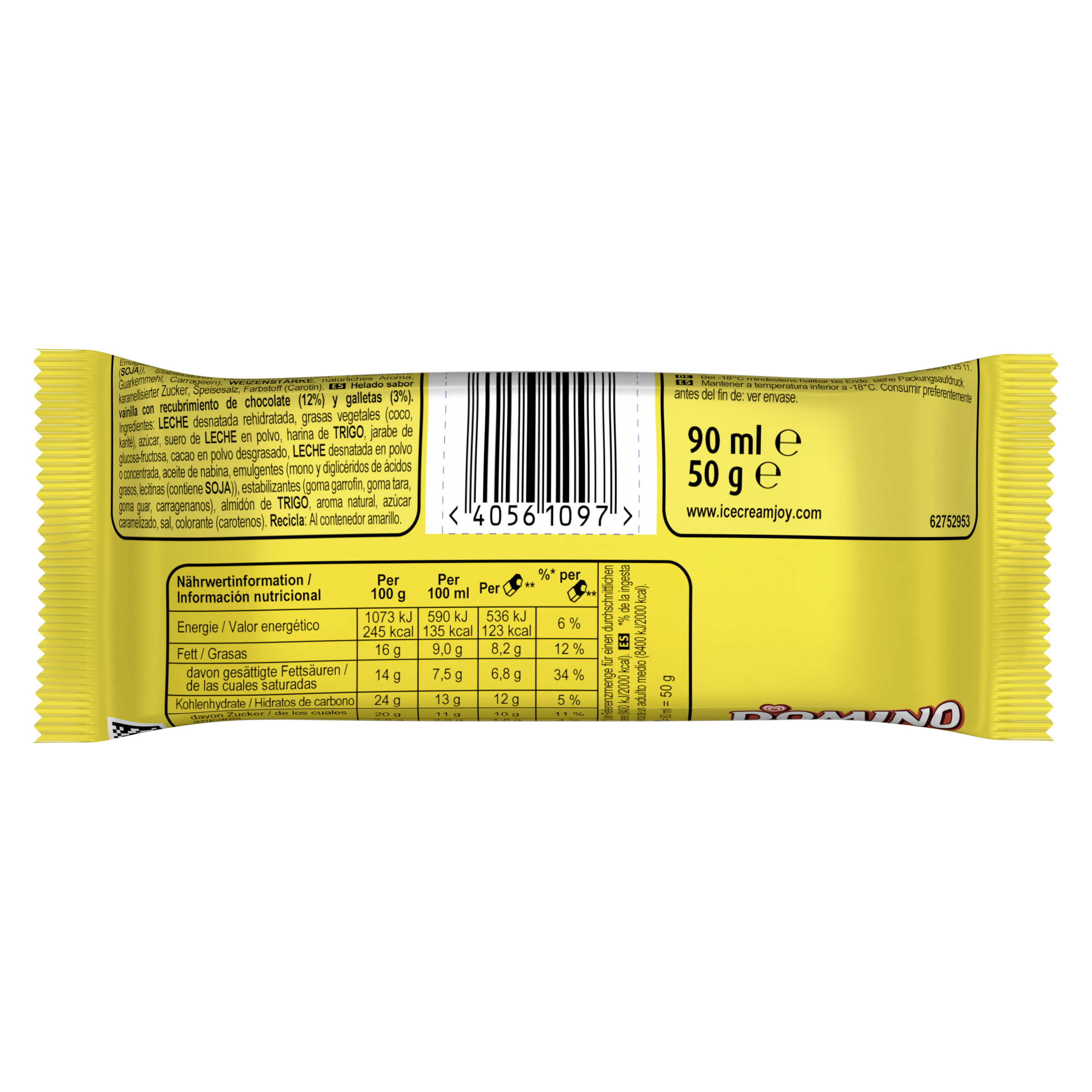 Frei nach dem Motto "Trends kommen und gehen, Domino bleibt", gehöre ich seit über 60 Jahren zum Langnese Clan. Ich hülle mein zartes Eis mit Vanillegeschmack auf der einen Seite in eine leckere Kakaoglasur und auf der anderen in unsere beliebte Waf