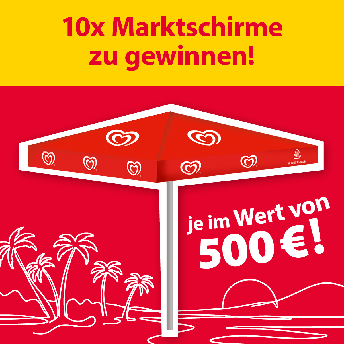 Tauche bereits jetzt ein in echtes Sommerfeeling und sichere dir die Chance auf einen von unseren 10 beliebten Langnese Marktschirmen – inklusive Fußständer. Mit ihren großzügigen Maßen schaffen sie Schatten, Atmosphäre und pure Wohlfühlmomente für Deinen Außenbereich.