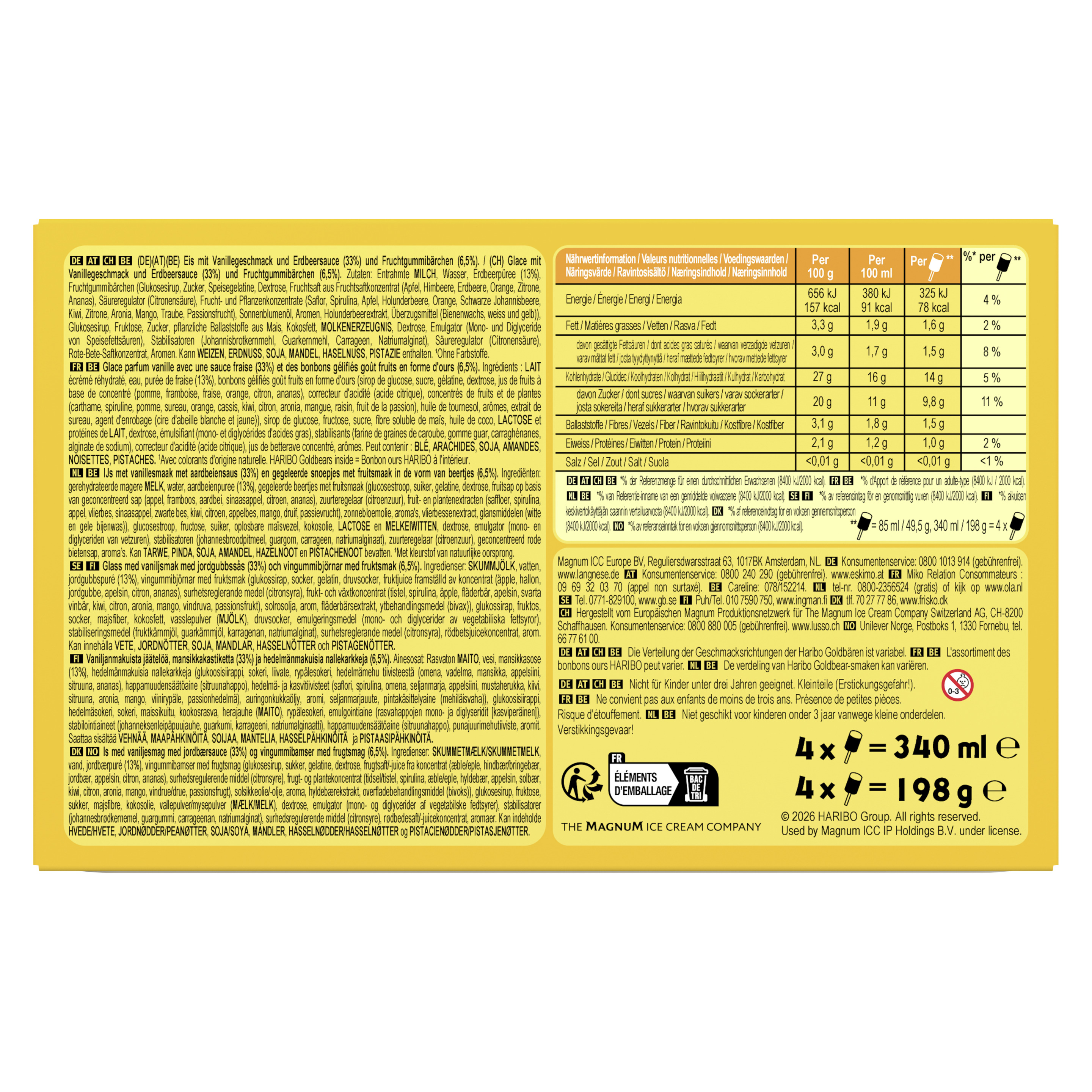 Zutaten: Entrahmte MILCH, Wasser, Erdbeerpüree (13%), Fruchtgummibärchen (Glukosesirup, Zucker, Speisegelatine, Dextrose, Fruchtsaft aus Fruchtsaftkonzentrat (Apfel, Himbeere, Erdbeere, Orange, Zitrone, Ananas), Säureregulator (Citronensäure), Frucht- und Pflanzenkonzentrate (Saflor, Spirulina, Apfel, Holunderbeere, Orange, Schwarze Johannisbeere, Kiwi, Zitrone, Aronia, Mango, Traube, Passionsfrucht), Sonnenblumenöl, Aromen, Holunderbeerextrakt, Überzugsmittel (Bienenwachs, weiss und gelb)), Glukosesirup, Fruktose, Zucker, pflanzliche Ballaststoffe aus Mais, Kokosfett, MOLKENERZEUGNIS, Dextrose, Emulgator (Mono- und Diglyceride von Speisefettsäuren), Stabilisatoren (Johannisbrotkernmehl, Guarkernmehl, Carrageen, Natriumalginat), Säureregulator (Citronensäure), Rote-Bete-Saftkonzentrat, Aromen. Kann WEIZEN, ERDNUSS, SOJA, MANDEL, HASELNUSS und PISTAZIE enthalten.