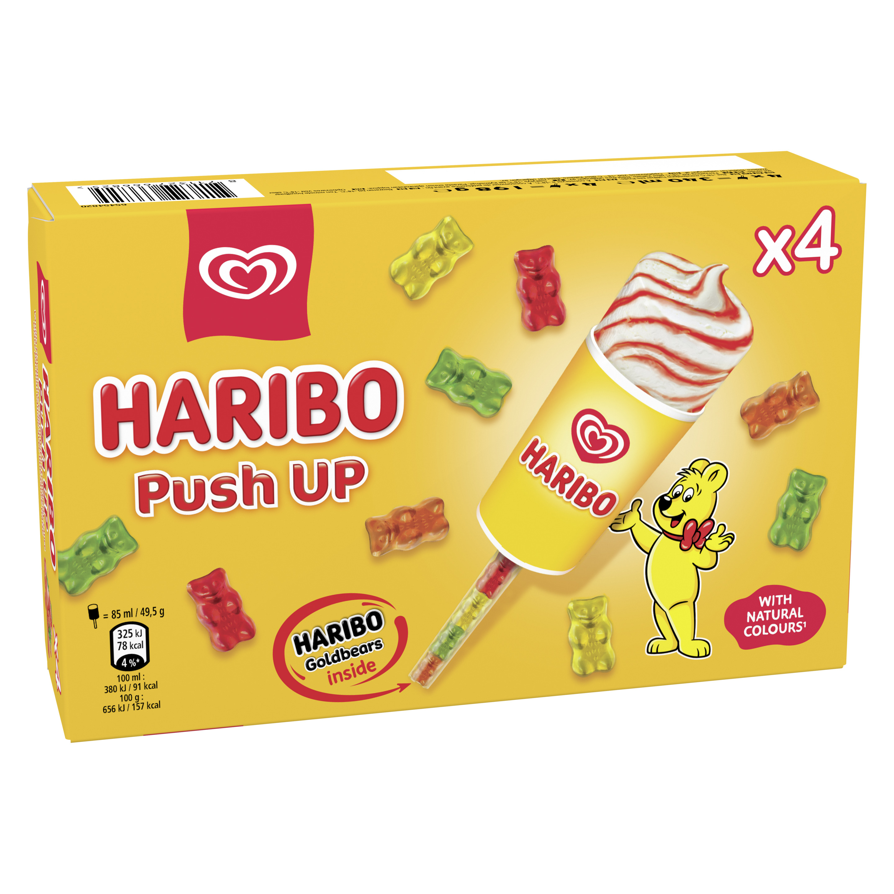 Entdecke das Haribo Push Up von Langnese jetzt auch im Multipack. Cremiges Eis mit Vanillegeschmack, durchstrudelt mit fruchtiger Erdbeersauce und Haribo Goldbären im Stiel.