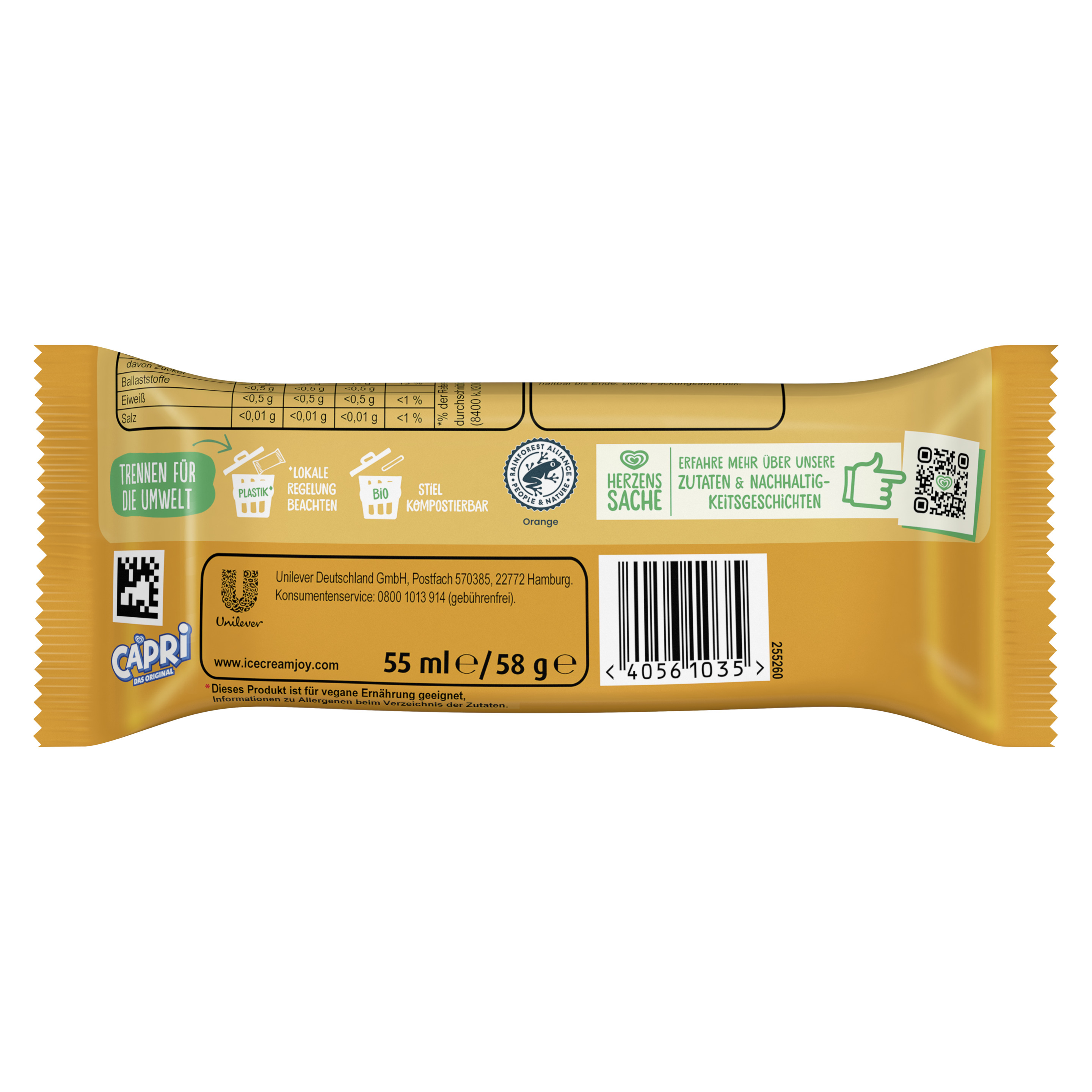 Das vegane Orangenfruchteis Langnese Capri bietet seit den 50er-Jahren erfrischendes Sommerfeeling mit der Extraportion Fruchtsaft aus nachhaltig angebauten Orangen.
