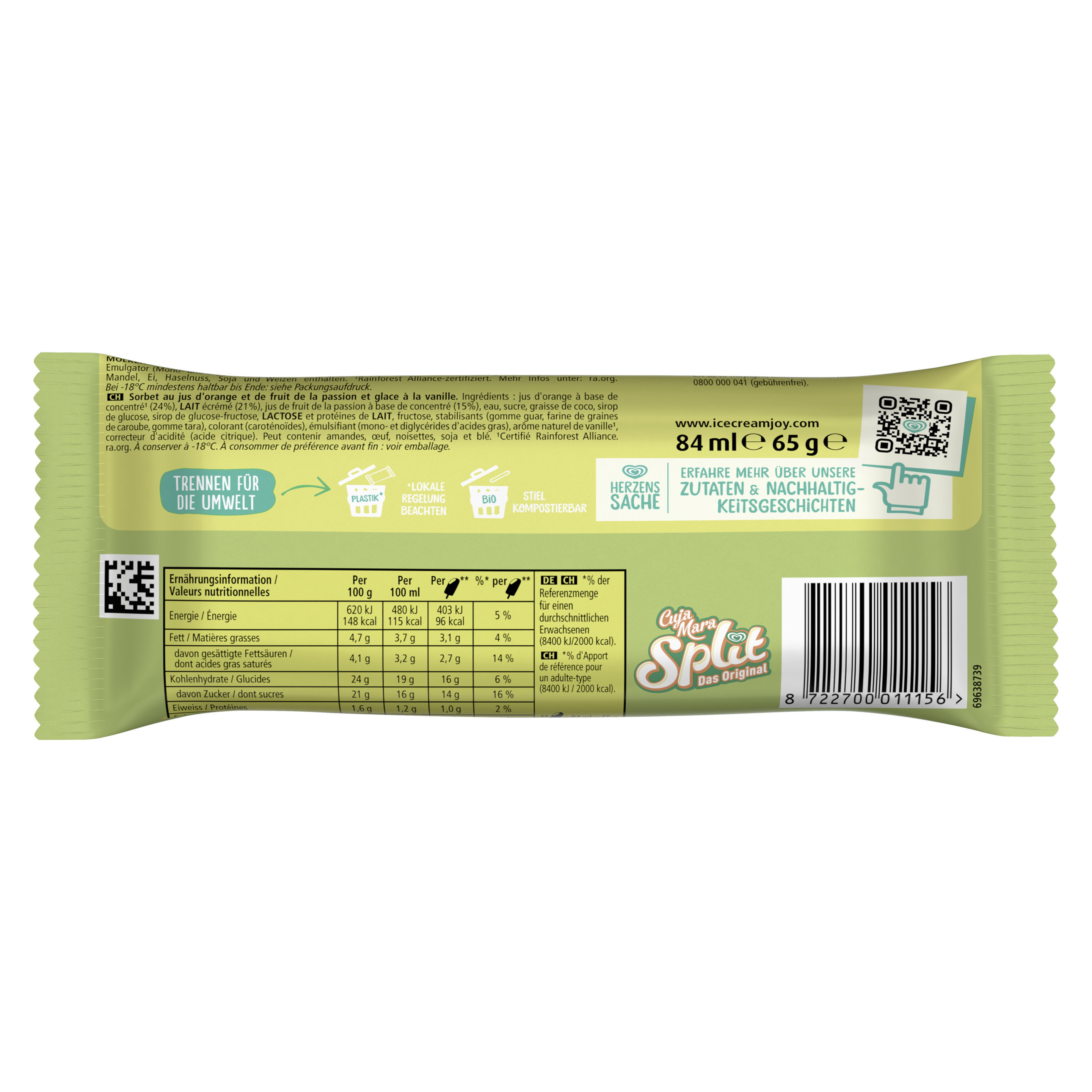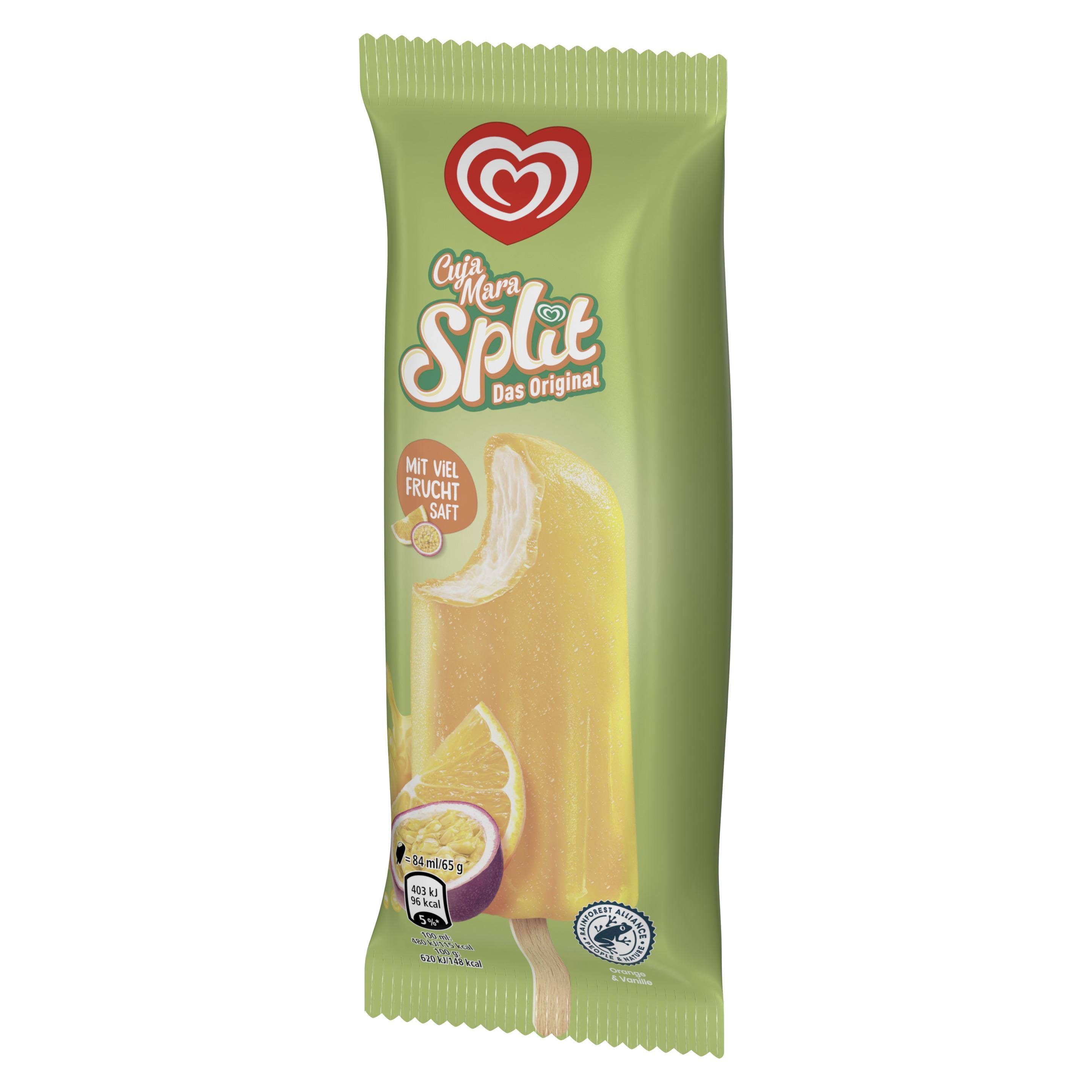 Mit Cuja Mara Split kann man beides haben – cremigen Eisgenuss und Fruchtvergnügen mit Fruchtsaft aus nachhaltig angebauten Orangen und Rainforest Alliance-zertifiziertem, natürlichen Vanillearoma.