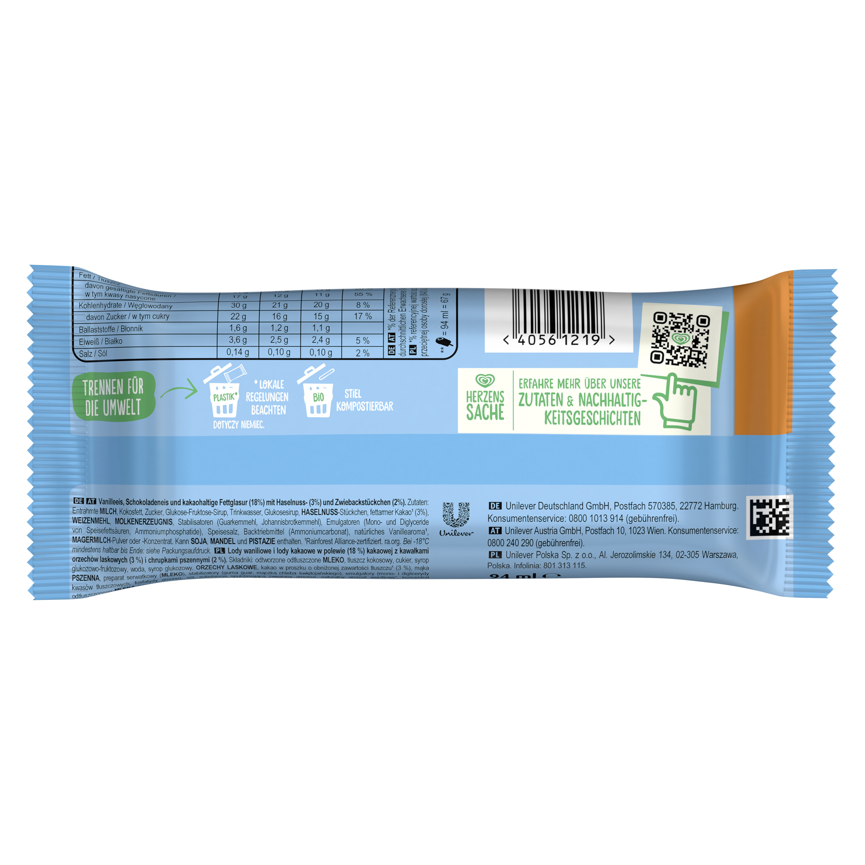 Vanilleeis, Schokoladeneis und kakaohaltige Fettglasur (18%) mit Haselnuss- (3%) und Zwiebackstückchen (2%).