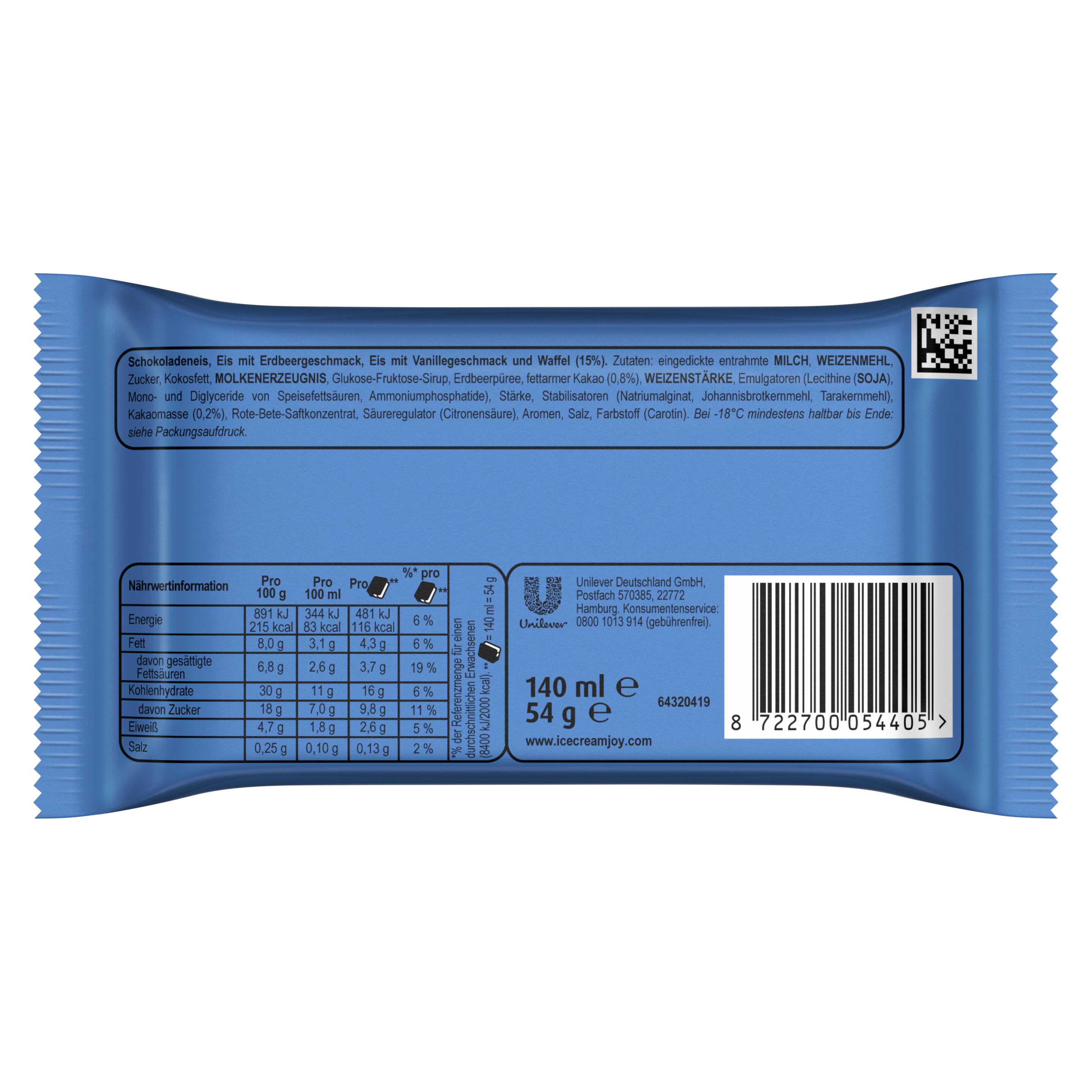 Schokoladeneis, Eis mit Erdbeergeschmack, Eis mit Vanillegeschmack und Waffel (15%).