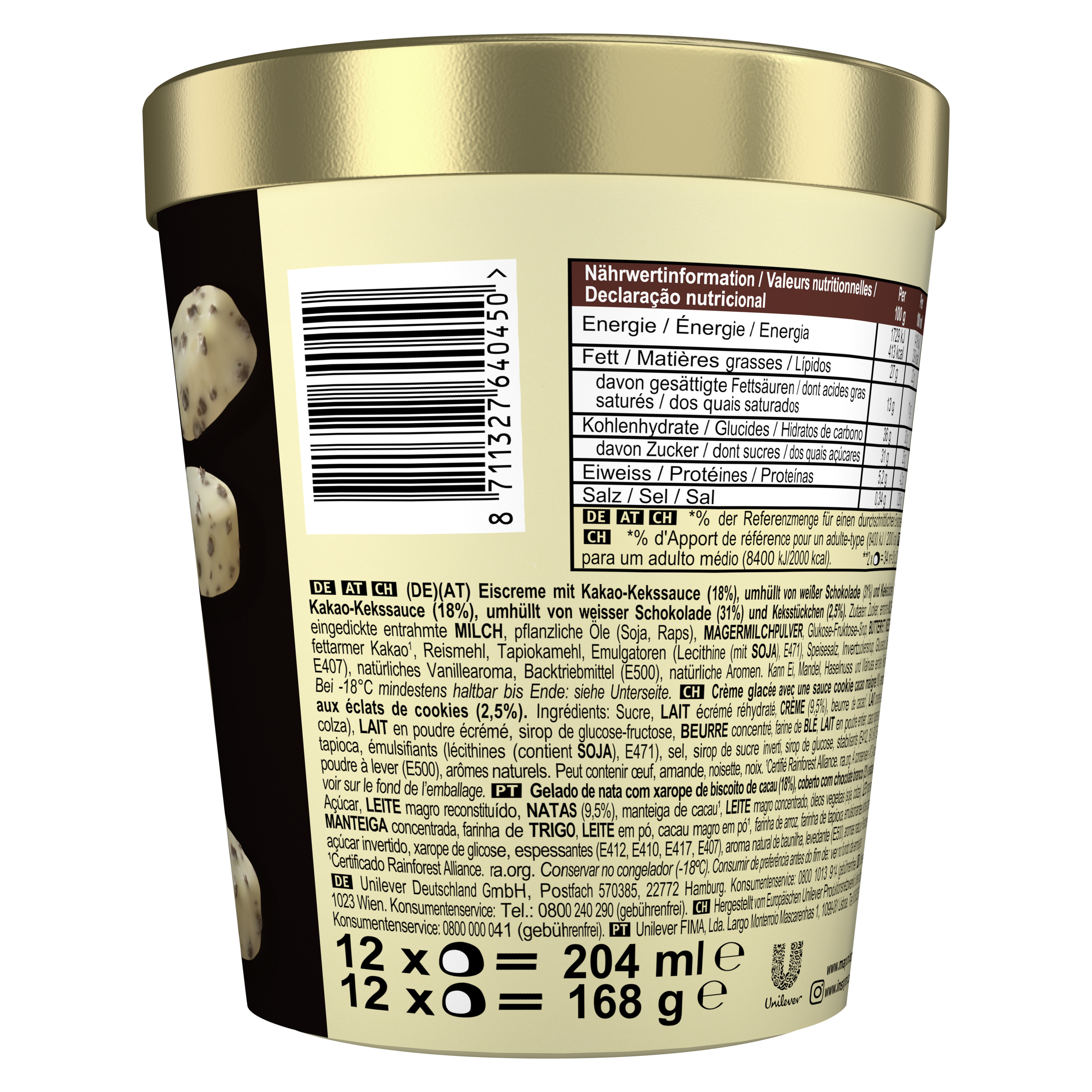 Zwölf Eispralinen im praktischen Becher. Hier trifft Eiscreme auf eine Kakao-Kekssauce, eine Hülle aus knackiger weißer Schokolade und Keksstückchen.