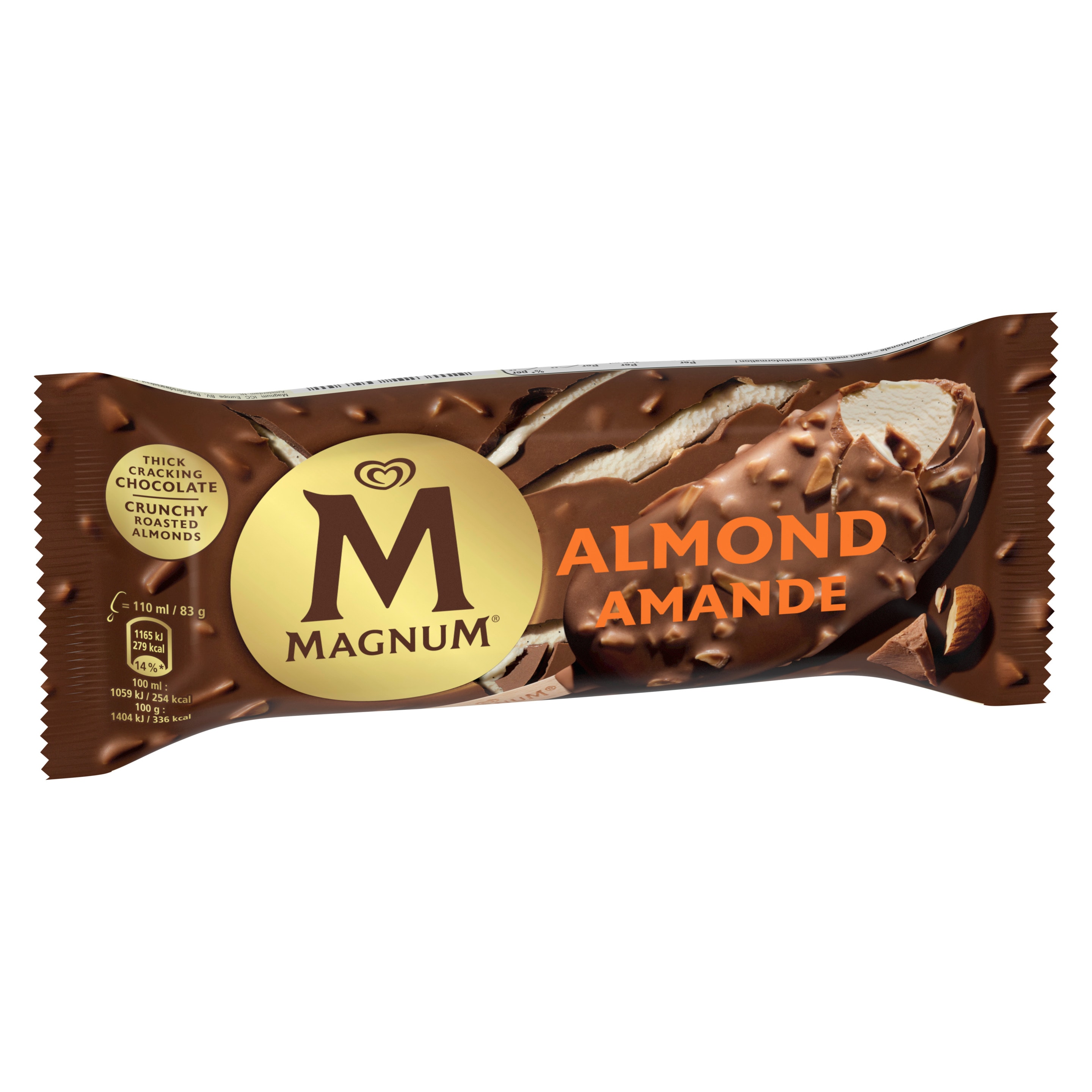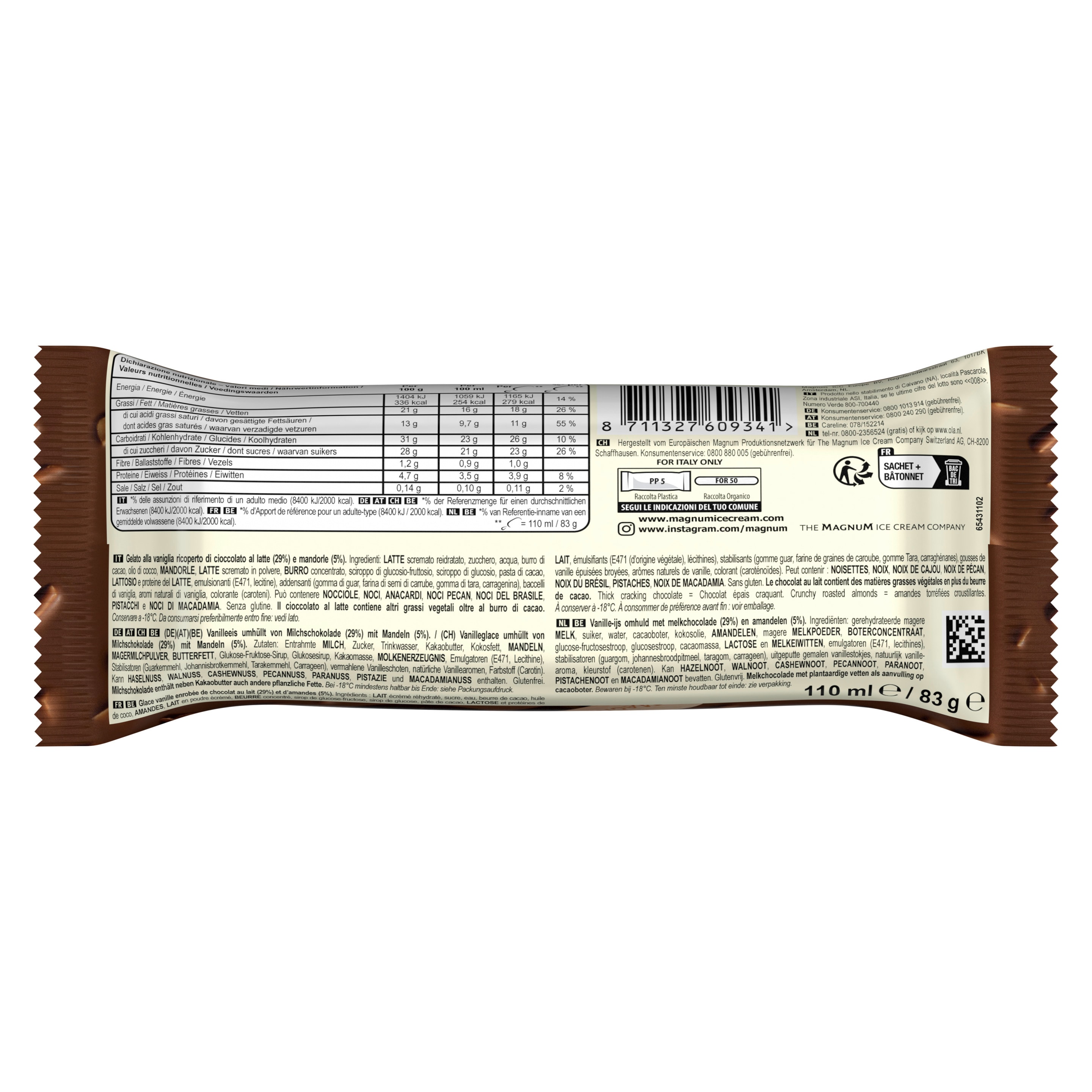 Ein Magnum Klassiker. Premium-Vanilleeis, umhüllt von köstlich knackiger Milchschokolade mit feinen, gerösteten Mandelstückchen.