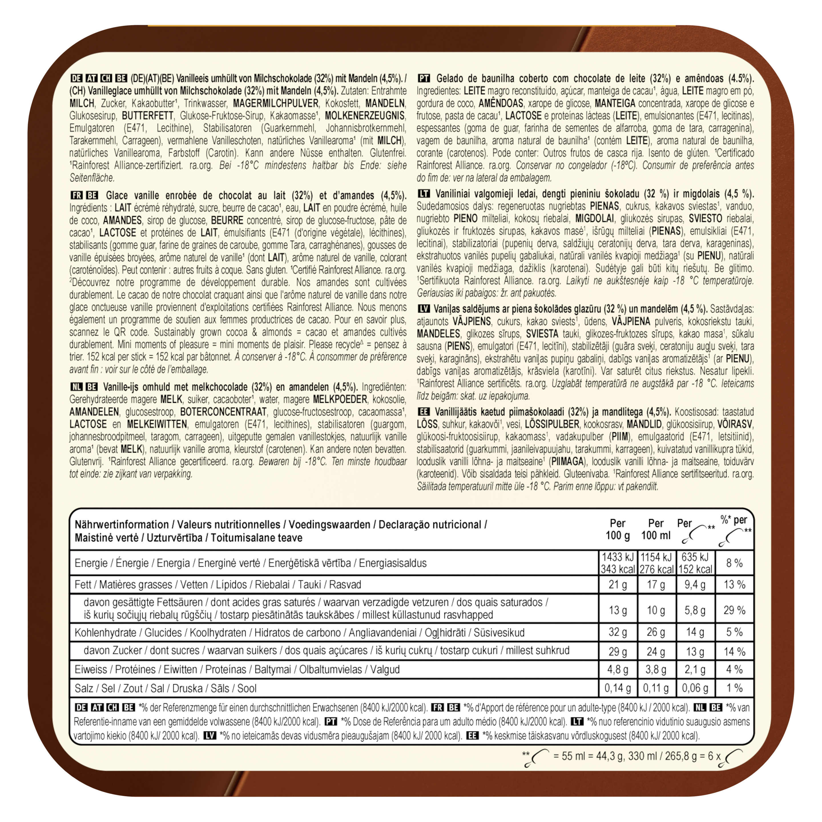 Zutaten: Entrahmte MILCH, Zucker, Kakaobutter¹, Trinkwasser, MAGERMILCHPULVER, Kokosfett, MANDELN, Glukosesirup, BUTTERFETT, Glukose-Fruktose-Sirup, Kakaomasse¹, MOLKENERZEUGNIS, Emulgatoren (E471, Lecithine), Stabilisatoren (Guarkernmehl, Johannisbrotkernmehl, Tarakernmehl, Carrageen), vermahlene Vanilleschoten, natürliches Vanillearoma¹ (mit MILCH), natürliches Vanillearoma, Farbstoff (Carotin). Kann andere Nüsse enthalten.¹Rainforest Alliance-zertifiziert.