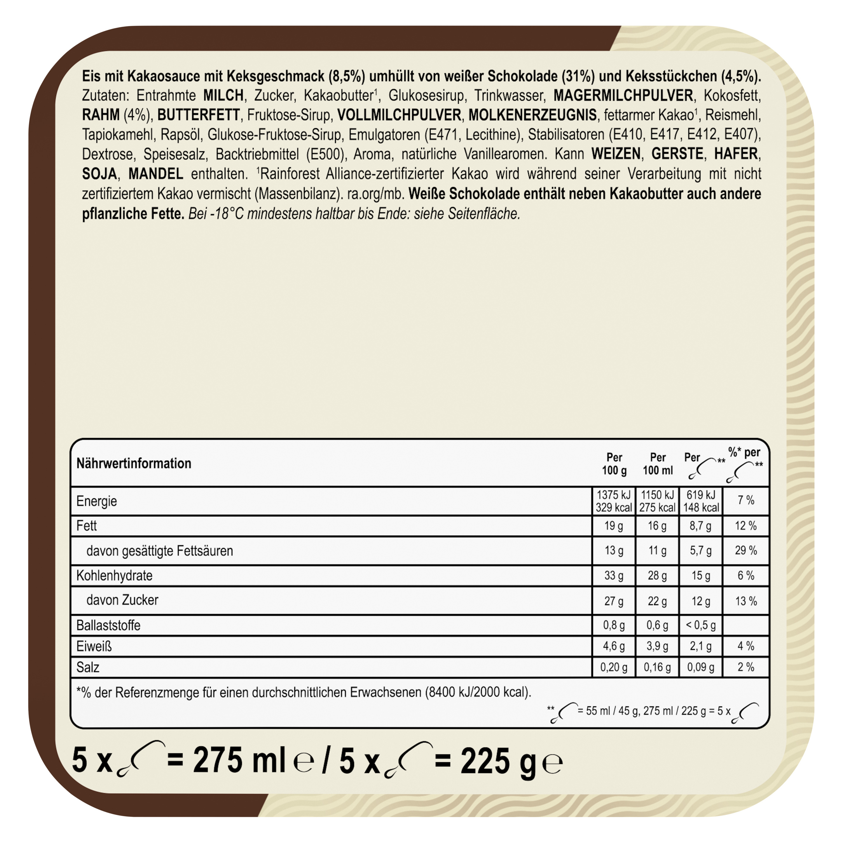 Zutaten: Entrahmte MILCH, Zucker, Kakaobutter¹, Glukosesirup, Trinkwasser, MAGERMILCHPULVER, Kokosfett, RAHM (4%), BUTTERFETT, Fruktose-Sirup, VOLLMILCHPULVER, MOLKENERZEUGNIS, fettarmer Kakao¹, Reismehl, Tapiokamehl, Rapsöl, Glukose-Fruktose-Sirup, Emulgatoren (E471, Lecithine), Stabilisatoren (E410, E417, E412, E407), Dextrose, Speisesalz, Backtriebmittel (E500), Aroma, natürliche Vanillearomen. Kann WEIZEN, GERSTE, HAFER, SOJA, MANDEL enthalten. ¹Rainforest Alliance-zertifizierter Kakao wird während seiner Verarbeitung mit nicht zertifiziertem Kakao vermischt (Massenbilanz).