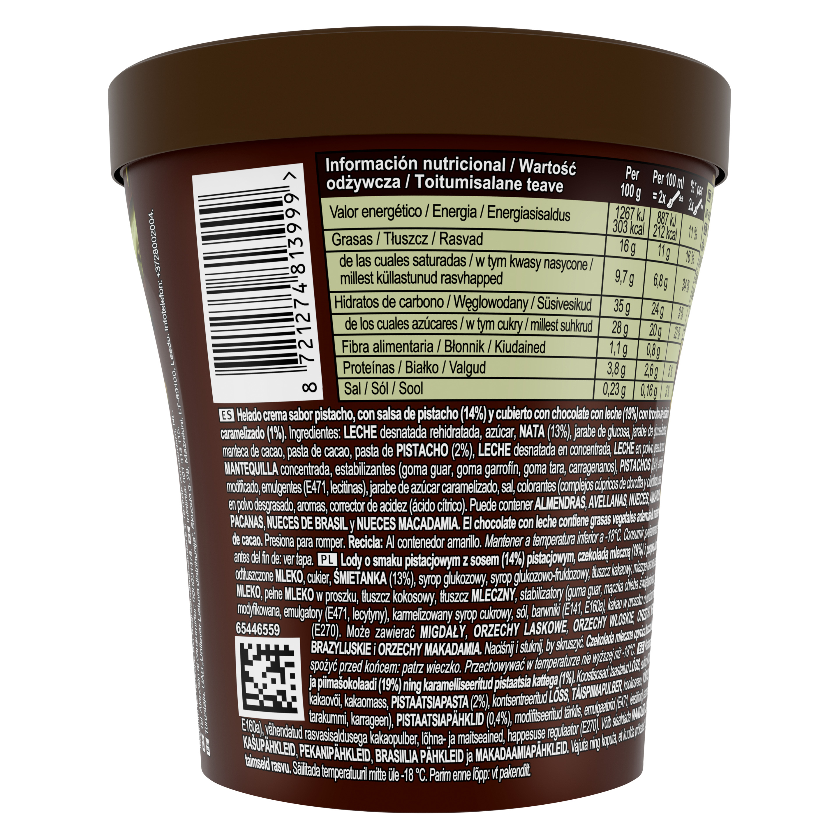 Zutaten: Entrahmte MILCH, Zucker, RAHM (13%), Glukosesirup, Glukose-Fruktose-Sirup, Kakaobutter, Kakaomasse, PISTAZIEN-Paste (2%), konzentrierte MAGERMILCH, VOLLMILCHPULVER, Kokosfett, BUTTERFETT, Stabilisatoren (Guarkernmehl, Johannisbrotkernmehl, Tarakernmehl, Carrageen), PISTAZIEN (0,4%), modifizierte Stärke, Emulgatoren (E471, Lecithine), Karamellzuckersirup, Speisesalz, Farbstoffe (E 141, E160a), fettarmer Kakao, Aromen, Säureregulator (E270). Kann MANDEL, HASELNUSS, WALNUSS, CASHEWNUSS, PECANNUSS, PARANUSS, MACADAMIANUSS enthalten.