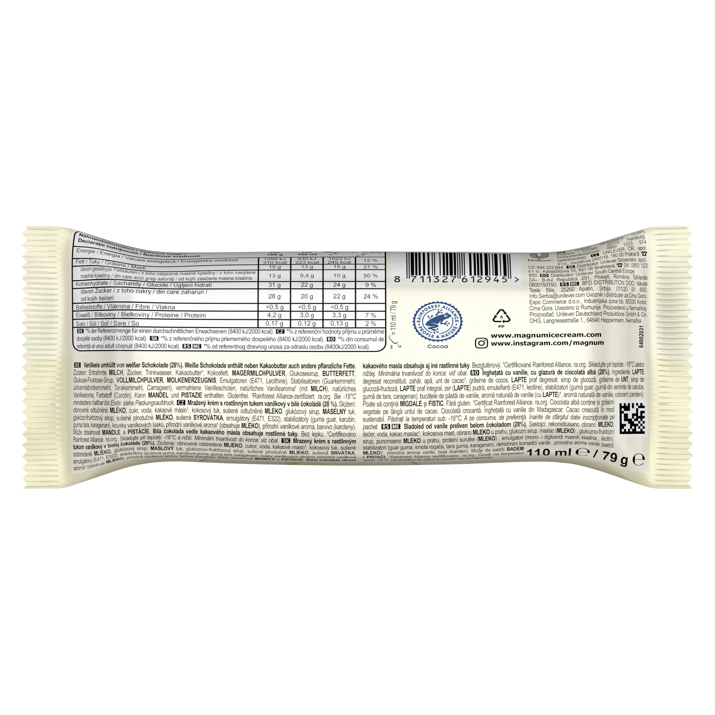 Zutaten: Entrahmte MILCH, Zucker, Trinkwasser, Kakaobutter¹, Kokosfett, MAGERMILCHPULVER, Glukosesirup, BUTTERFETT, Glukose-Fruktose-Sirup, VOLLMILCHPULVER, MOLKENERZEUGNIS, Emulgatoren (E471, Lecithine), Stabilisatoren (Guarkernmehl, Johannisbrotkernmehl, Tarakernmehl, Carrageen), vermahlene Vanilleschoten, natürliches Vanillearoma¹ (mit MILCH), natürliches Vanillearoma, Farbstoff (Carotin). Kann MANDEL und PISTAZIE enthalten.¹Rainforest Alliance-zertifiziert.