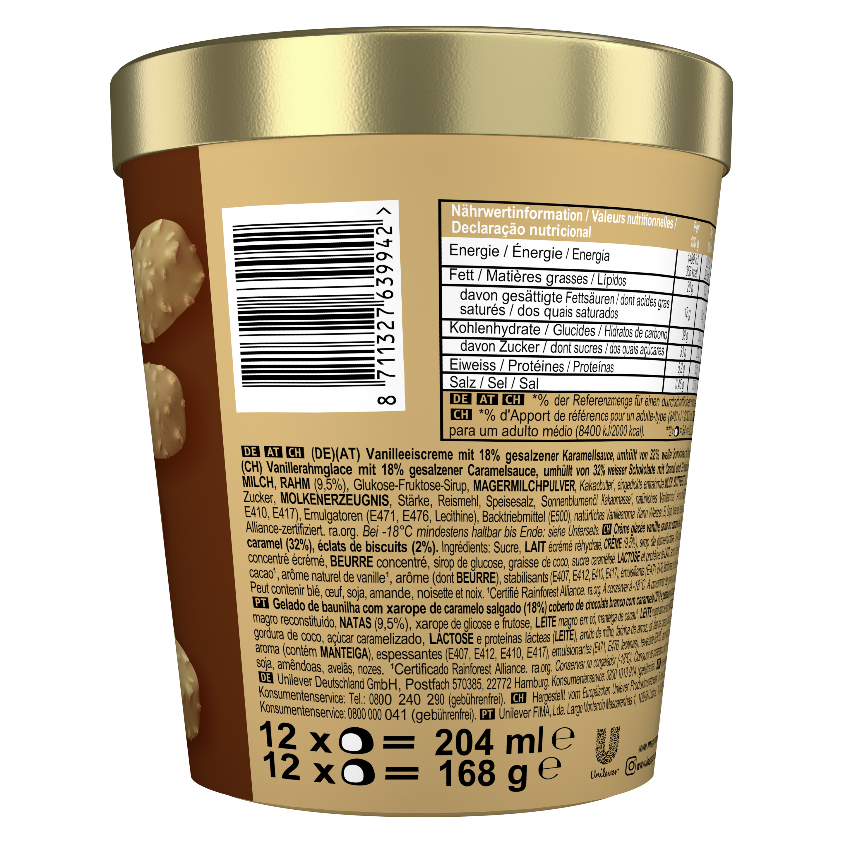Vanilleeiscreme mit 18% gesalzener Karamellsauce, umhüllt von 32% weißer Schokolade mit Karamell und 2% Keksstückchen.