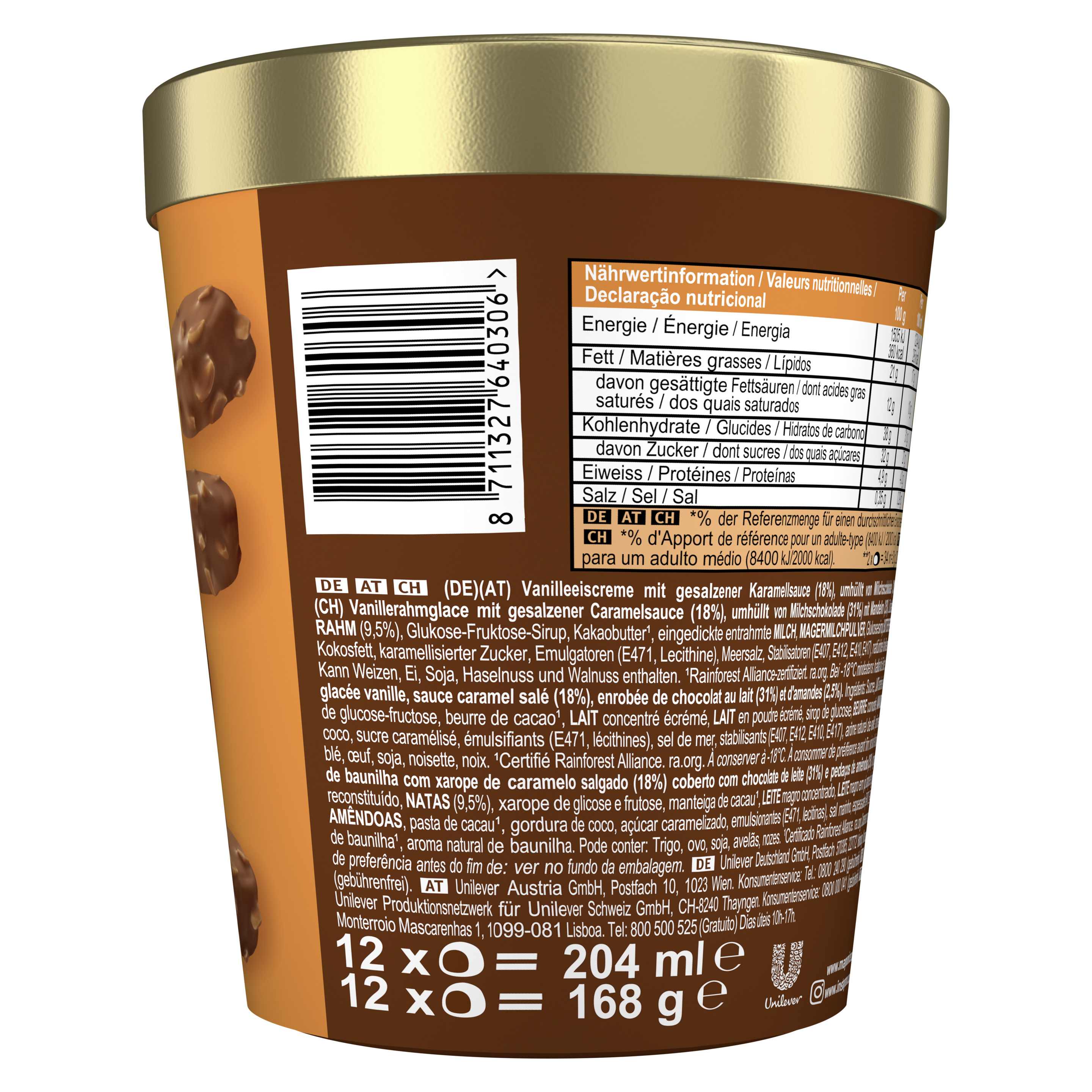 Vanilleeiscreme mit gesalzener Karamellsauce (18%), umhüllt von Milchschokolade (31%) mit Mandeln (2,5%).