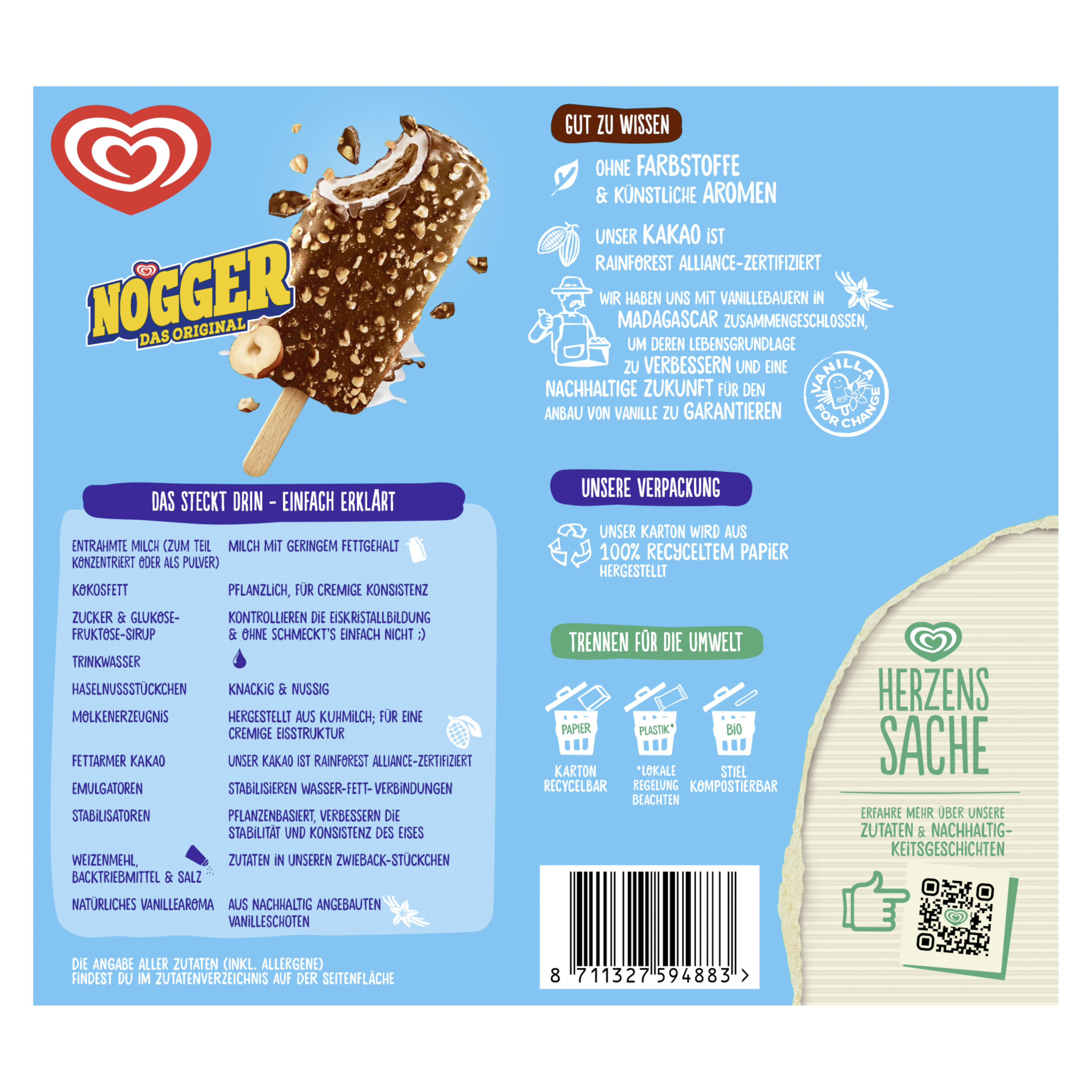 Nogger ist einer der Klassiker bei Langnese. Mit knackigen Haselnussstückchen in der Hülle und dem cremigen Kern ist es ein Eis am Stiel der Sorte harte Schale, weicher Kern.