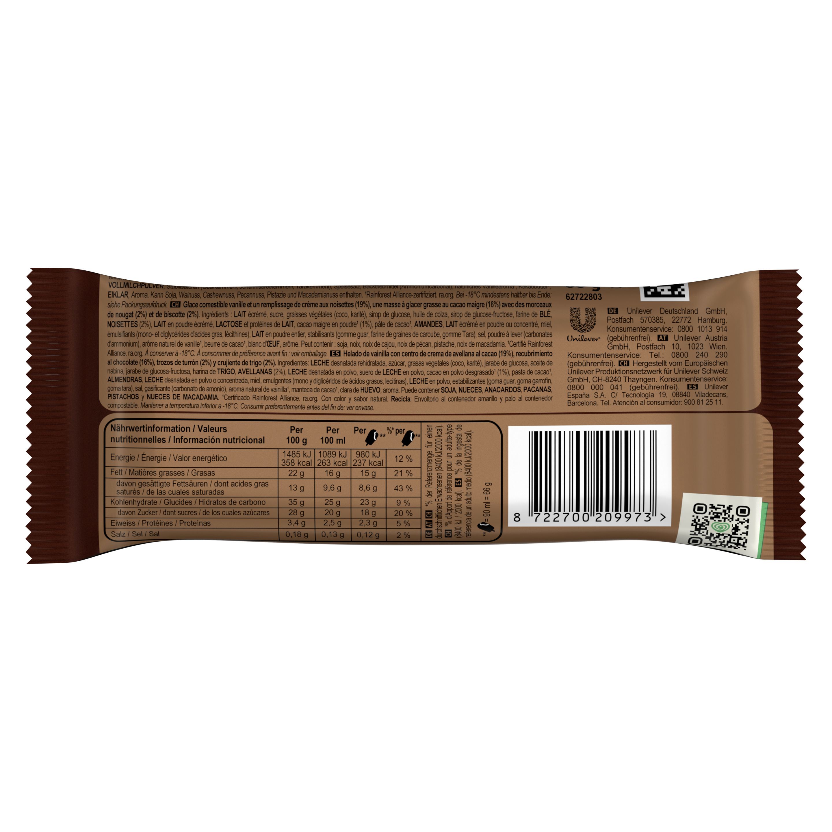 Vanilleeis mit Nougatcremefüllung (19%), kakaohaltige Fettglasur (16%) mit weißen Nougat- (2%) und Zwiebackstückchen (2%).