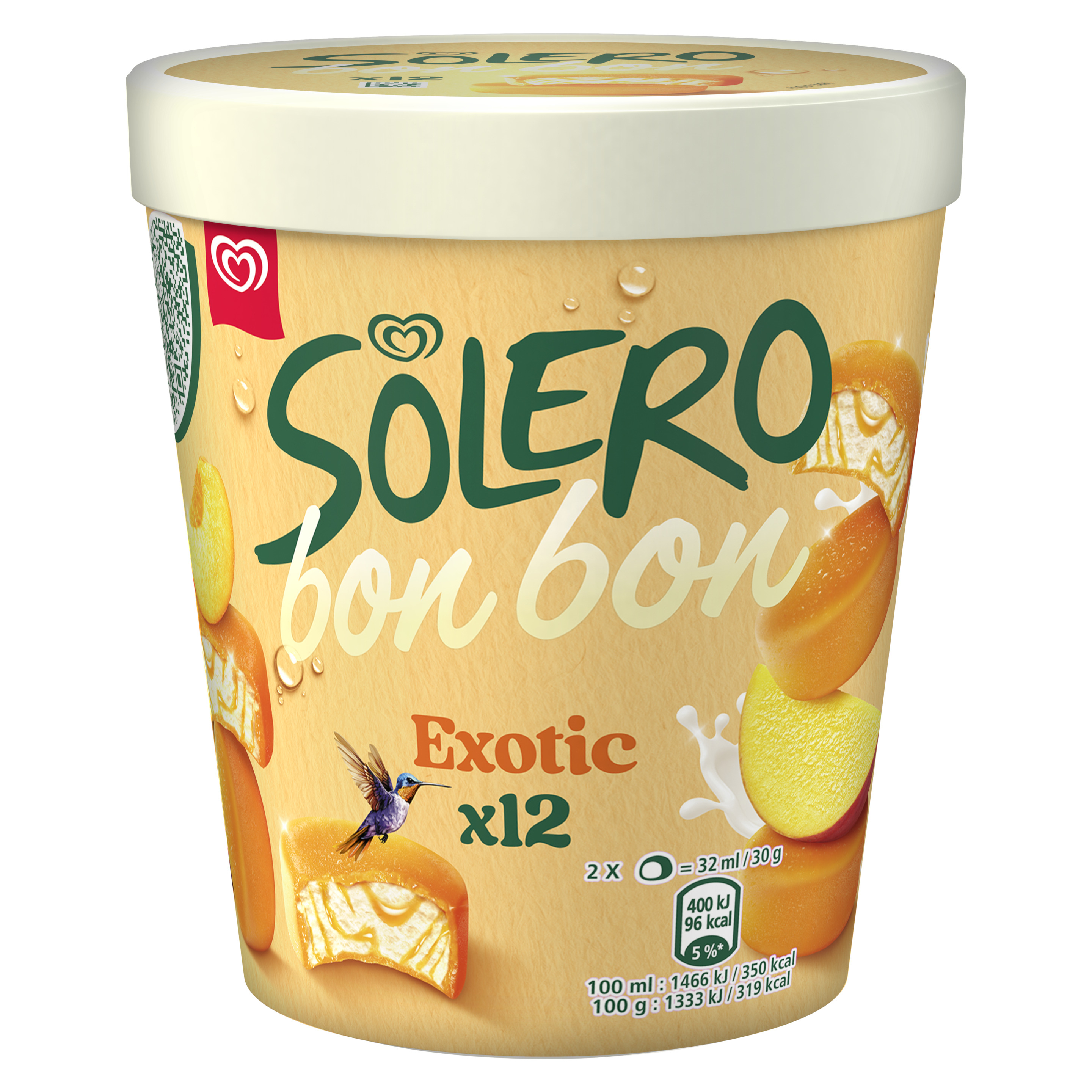 Köstliche Kombination aus cremigem Eis mit Vanillegeschmack, durchzogen mit Exotic-Frucht-Sauce und umhüllt von einer leckeren, fruchtigen Exotic-Glasur in mundgerechtem Bonbon-Format.