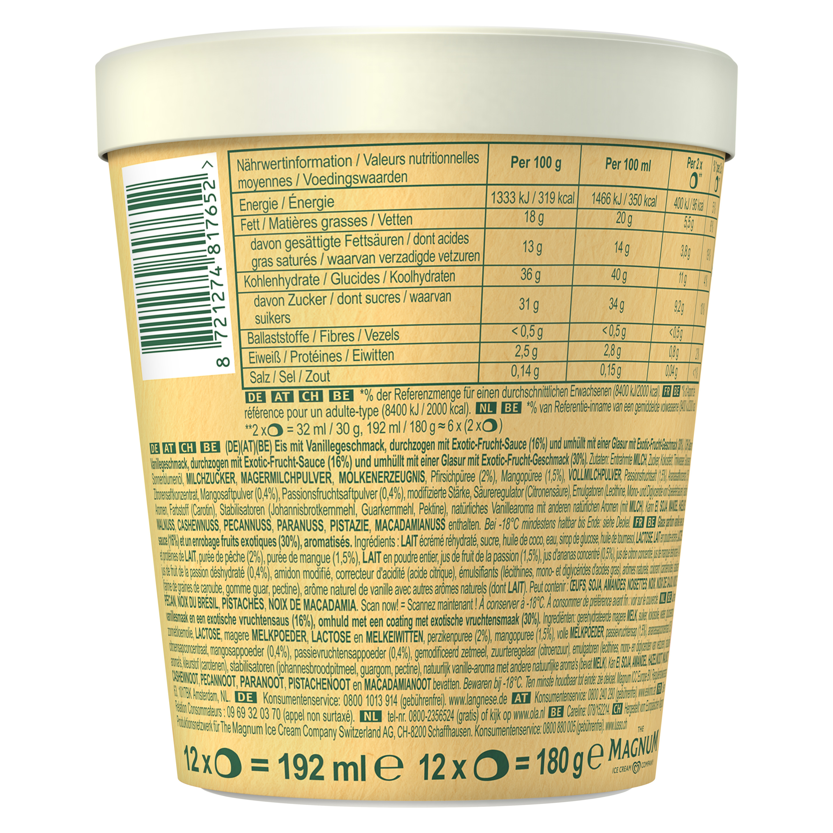 Zutaten: Entrahmte MILCH, Zucker, Kokosfett, Trinkwasser, Glukosesirup, Sonnenblumenöl, MILCHZUCKER, MAGERMILCHPULVER, MOLKENERZEUGNIS, Pfirsichpüree (2%), Mangopüree (1,5%), VOLLMILCHPULVER, Passionsfruchtsaft (1,5%), Ananassaftkonzentrat (0,5%), Zitronensaftkonzentrat, Mangosaftpulver (0,4%), Passionsfruchtsaftpulver (0,4%), modifizierte Stärke, Säureregulator (Citronensäure), Emulgatoren (Lecithine, Mono- und Diglyceride von Speisefettsäuren), natürliche Aromen, Farbstoff (Carotin), Stabilisatoren (Johannisbrotkernmehl, Guarkernmehl, Pektine), natürliches Vanillearoma mit anderen natürlichen Aromen (mit MILCH). Kann EI, SOJA, MANDEL, HASELNUSS, WALNUSS, CASHEWNUSS, PECANNUSS, PARANUSS, PISTAZIE, MACADAMIANUSS enthalten.