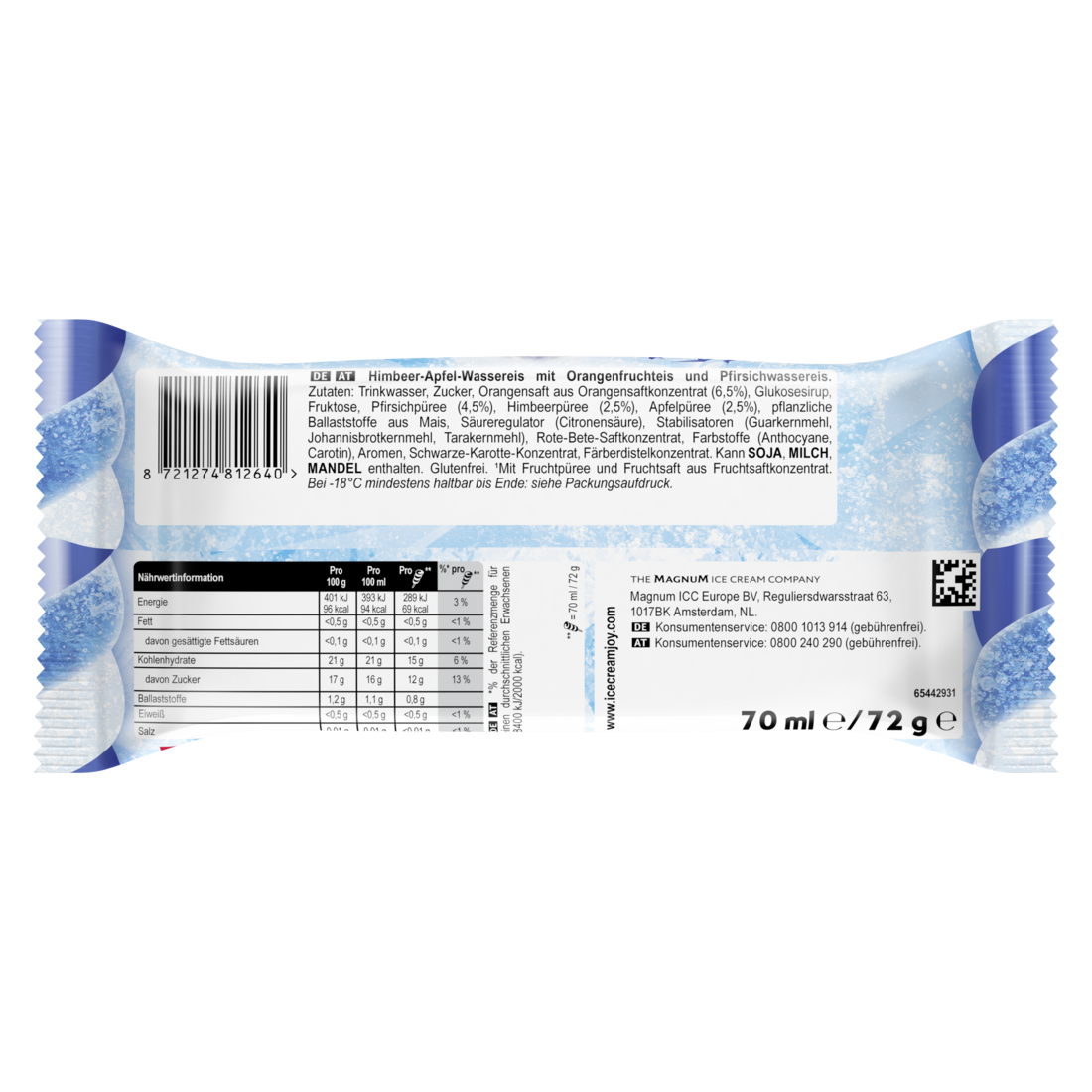 Himbeer-Apfel-Wassereis mit Orangenfruchteis und Pfirsichwassereis.